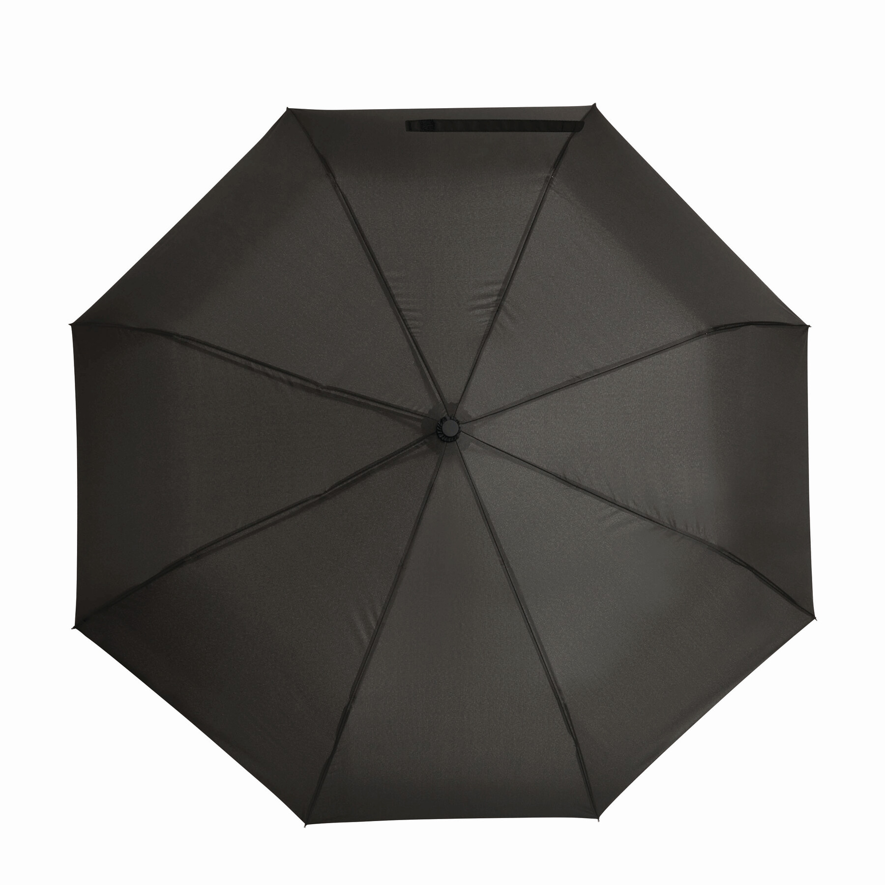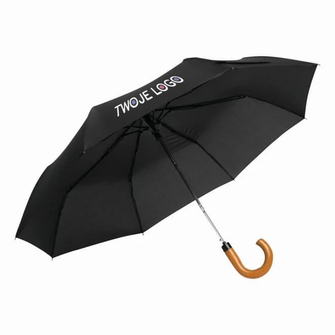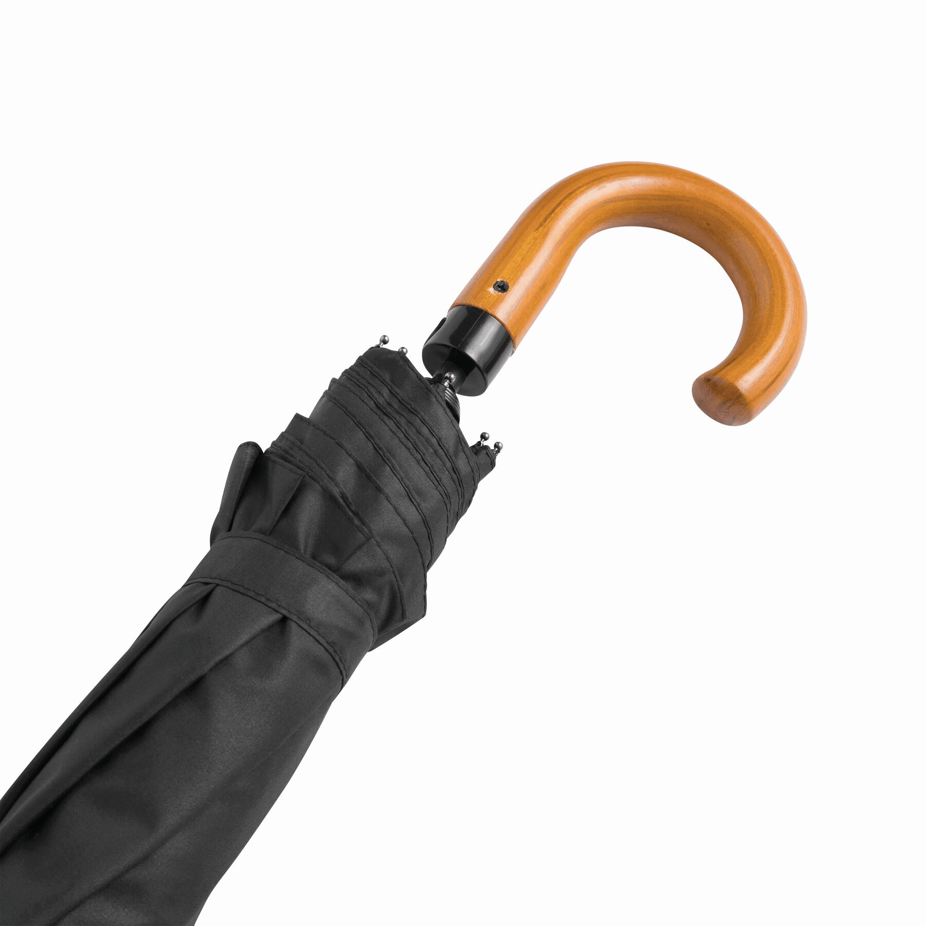 Męski parasol automatyczny LORD, 3 x składana metalowa laska, szyny z metalu/włókna szklanego, drewniany, zaokrąglony uchwyt, poszycie z poliestru pongee ze specjalną wodoodporną powłoką, pasek spinający na rzep.