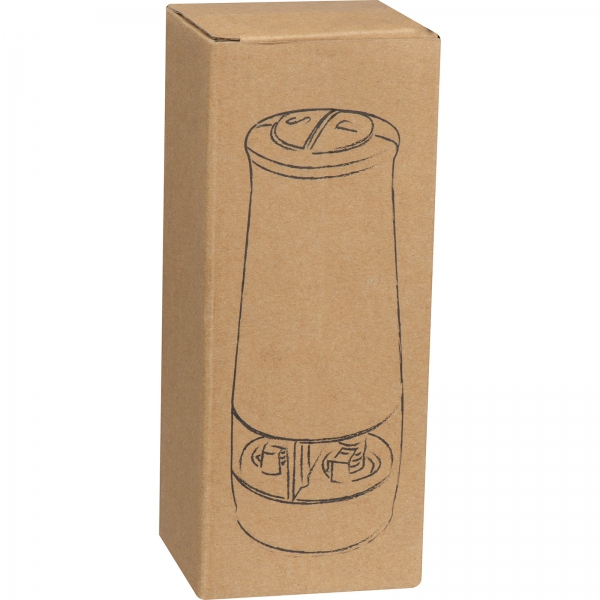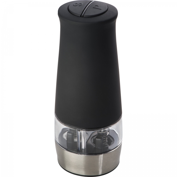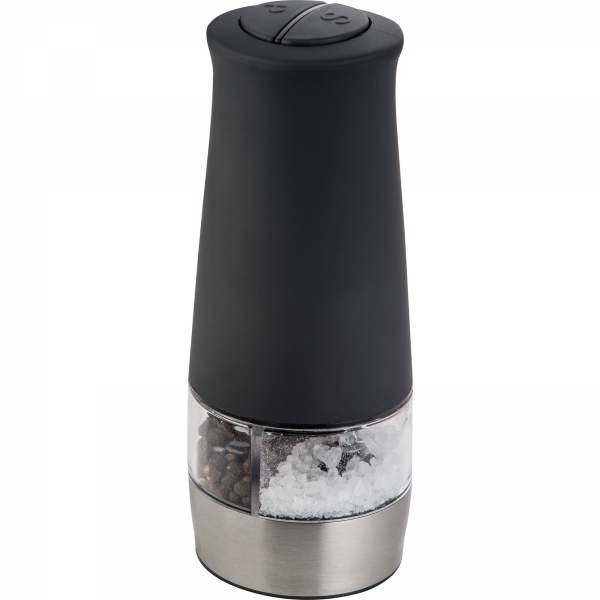Elektryczny młynek do soli i pieprzu ze stali nierdzewnej i akrylu, o gumowanej powierzchni. Posiada dwie oddzielne komory, które mogą być niezależnie obsługiwane za pomocą przycisków.