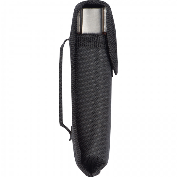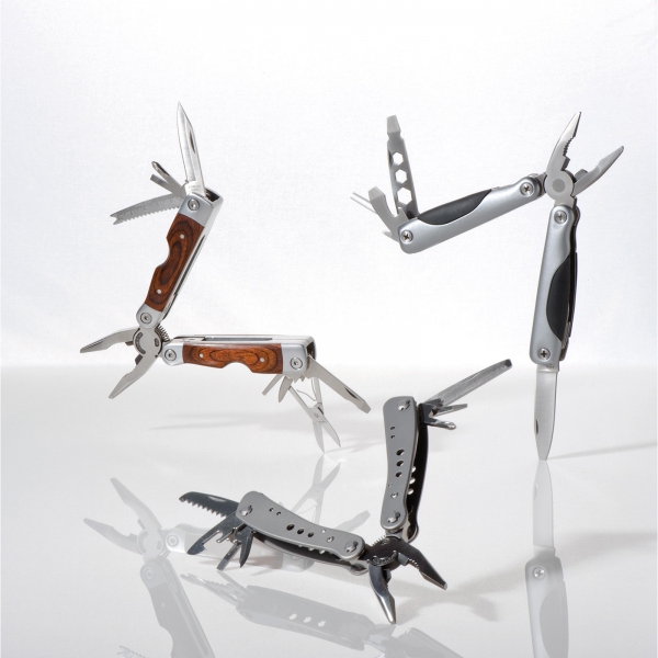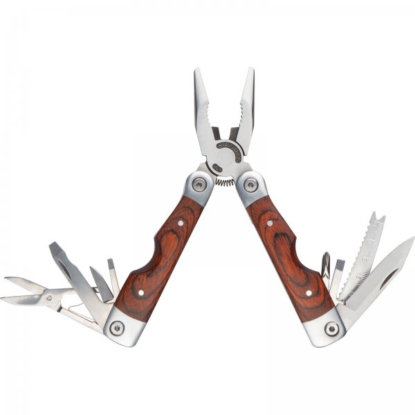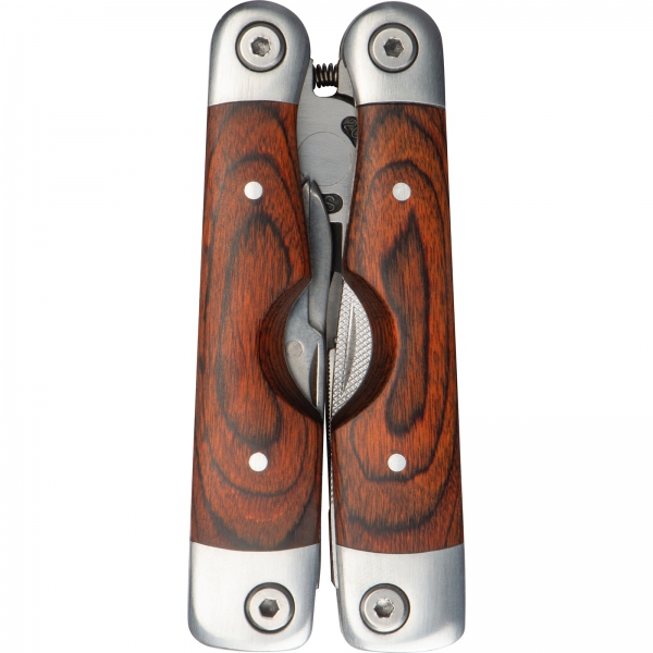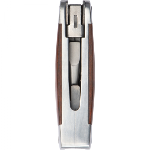 Wielofunkcyjny przyrząd ze stali nierdzewnej z drewnianymi uchwytami. Narzędzie wyposażono w nożyk, kombinerki, piłkę, nożyczki i śrubokręt.