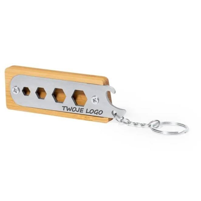 Narzędzie wielofunkcyjne w bambusowej obudowie, brelok do kluczy, 5 funkcji: 4 klucze imbusowe i otwieracz do butelek