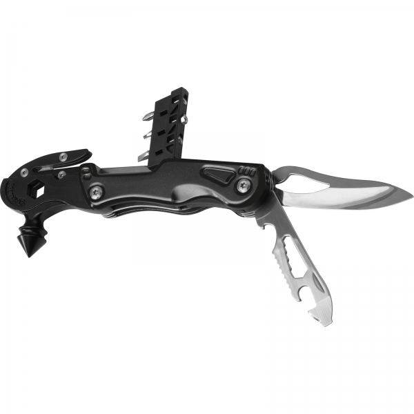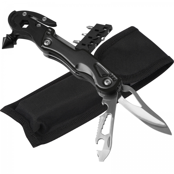 Multinarzędzie wykonane z metalu, posiada lampkę LED, młotek awaryjny, śrubokręt, klucz, otwieracz, nóż i przecinak do pasów bezpieczeństwa. Narzędzie zapakowane w pokrowiec. Produkt zawiera baterie.