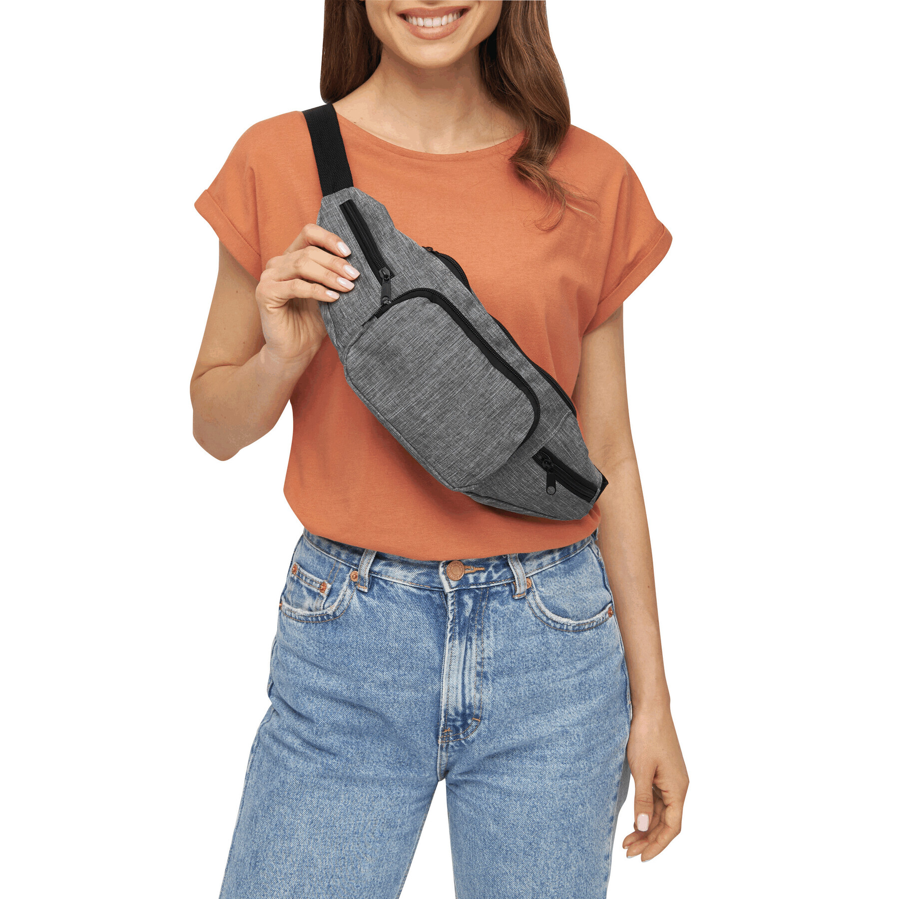 Nerka QUAD z przestronną komorą główną, kieszenią przednią oraz 2 kieszonkami bocznymi zapinanymi na zamek błyskawiczny. Regulowany pasek z klamrą.