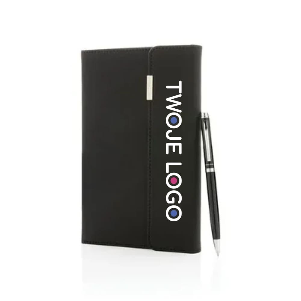 Luksusowy notatnik A5 (80 kremowych kartek 80 g/m2 w linie), okładka wykonana z PU z metalowym logo, długopis z niemieckim wkładem w komplecie, długość pisania ok. 1200 m, w ozdobnym pudełku, ślad węglowy produktu: 1,34 kg CO2