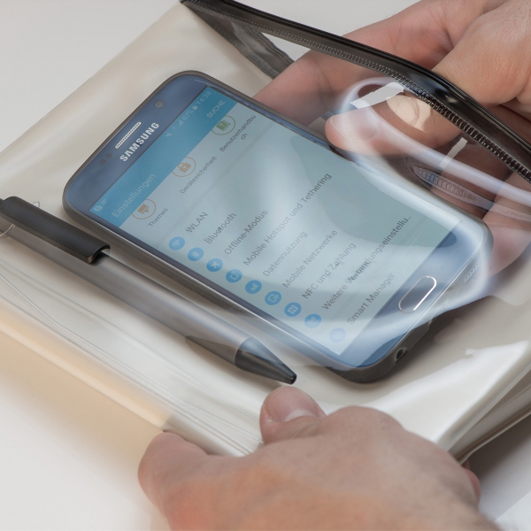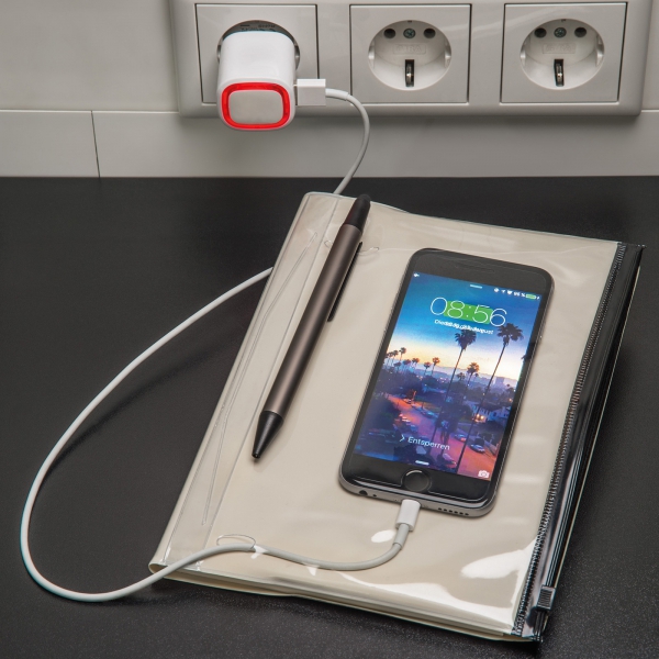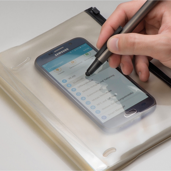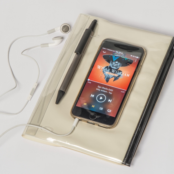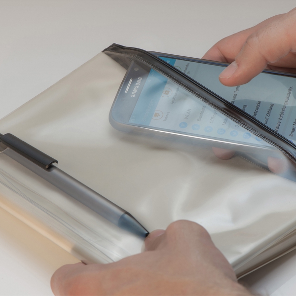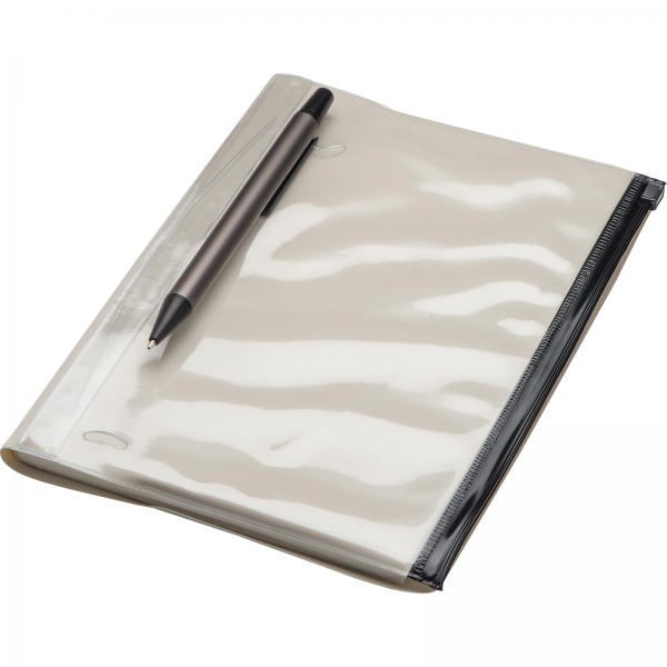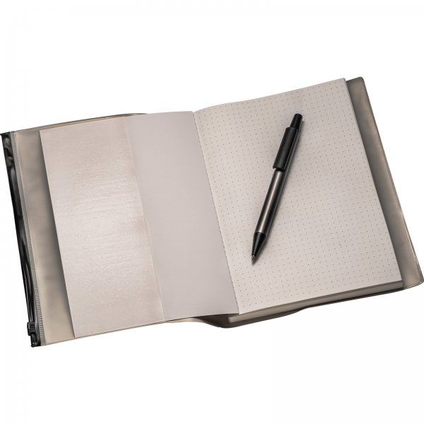 Notatnik (160 stron) w zestawie z długopisem. Notatnik posiada praktyczną okładkę z PVC, a w niej - kieszeń, w której można schować telefon i jednocześnie z niego korzystać.