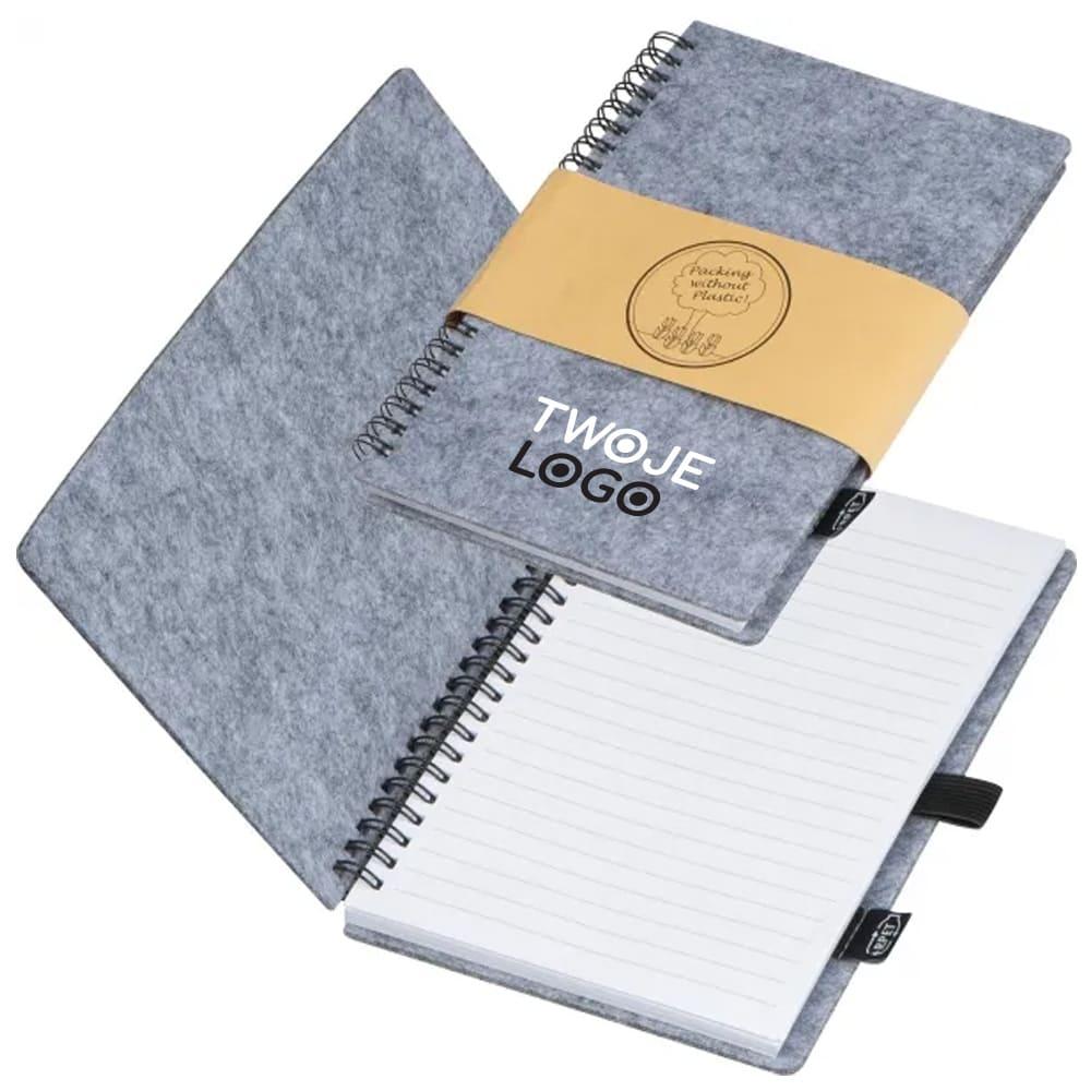 Notes wykonany z filcu RPET, o formacie A5 z 160 stronami w linie. Notes posiada spiralną oprawę i pętelkę na długopis.