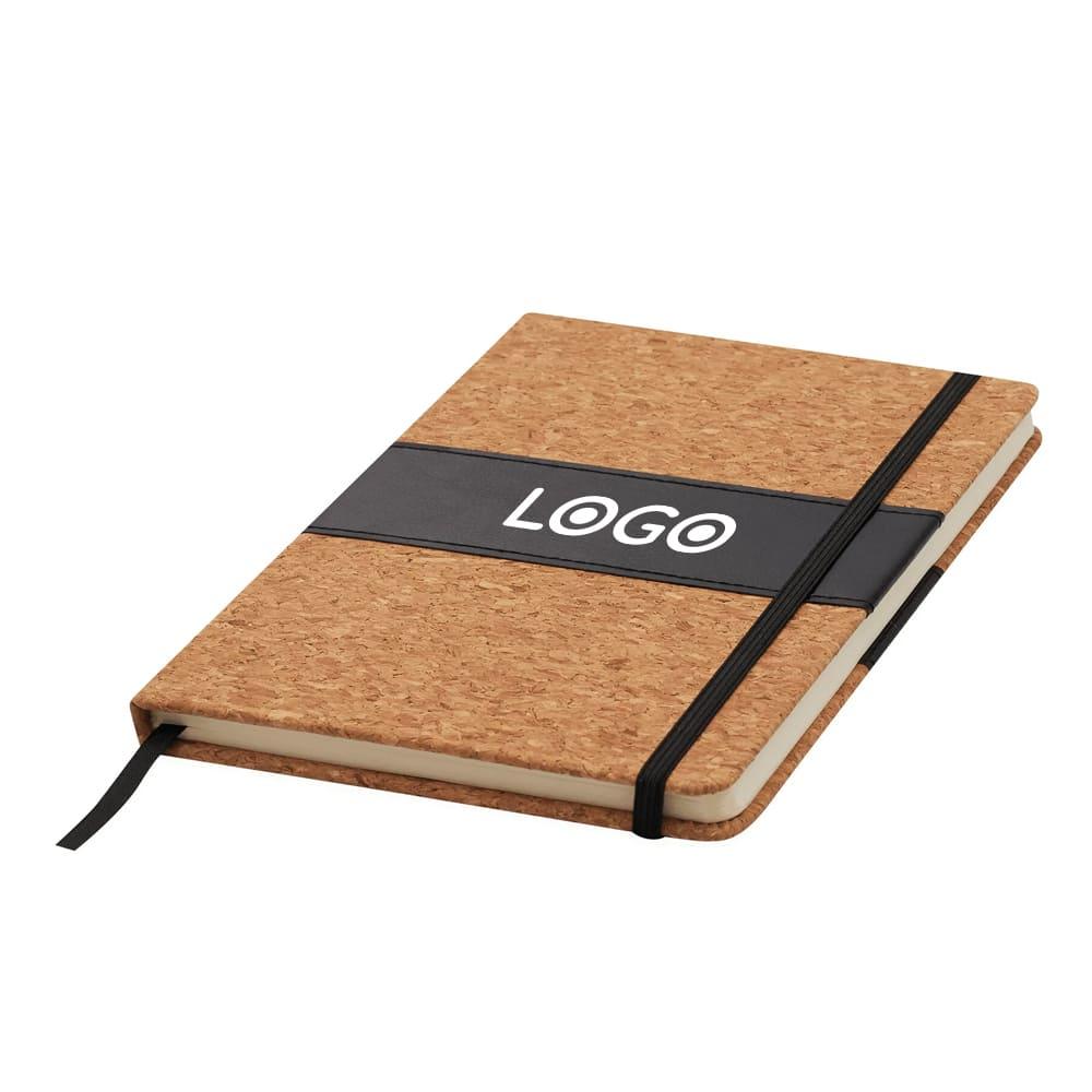 Notatnik AMBIENCE w formacie A5. Z zaokrąglonymi rogami, ze zintegrowaną zakładką i gumką do zamykania. Papier 70 g/m², 90 kartek w linie. Korkowa oprawa z ozdobnym paskiem PU.