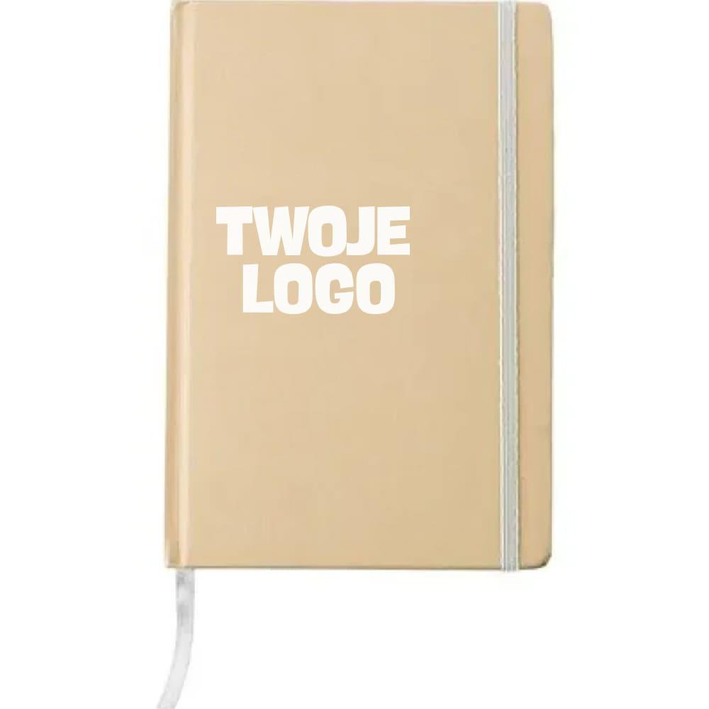 Notatnik (ok. A5, 80 kartek w linie), wykonany z kartonu z recyklingu, tasiemka zakładkowa, elastyczna opaska do zamykania