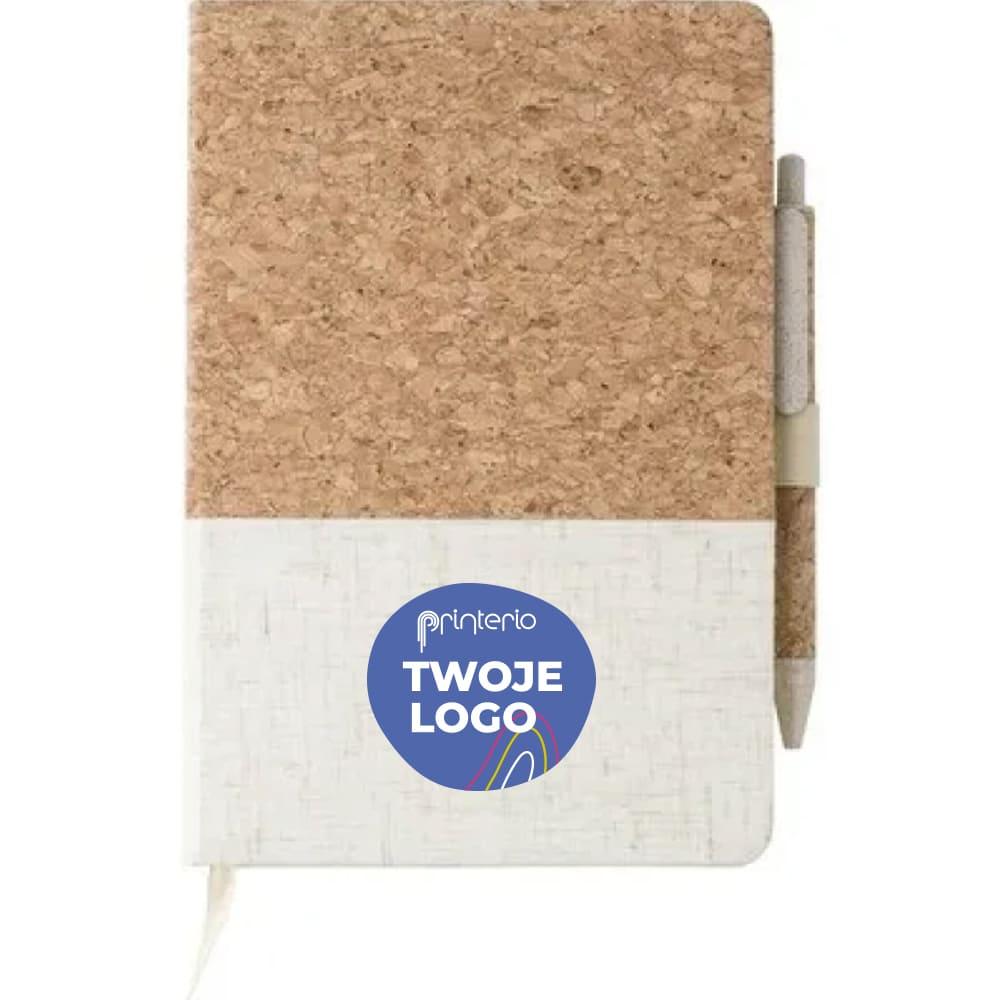 Notatnik (ok. A5, 80 kartek w linie), okładka wykonana z korka i płótna, tasiemka zakładkowa, długopis ze słomy pszenicznej w komplecie, w pudełku
