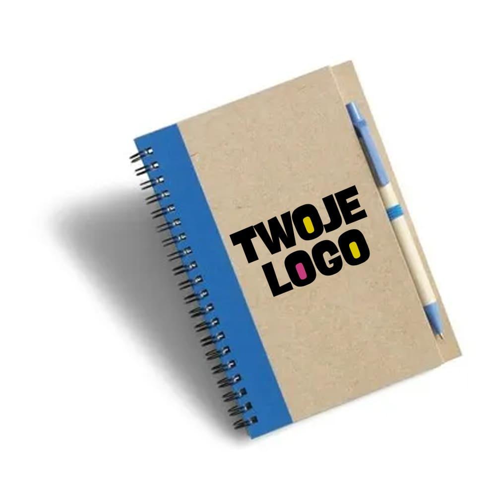 Notatnik w formacie ok. A5, posiada 60 kartek w linie (120 stron) i spiralne bindowanie, w komplecie znajduje się długopis z kolorowymi elementami, wkład w niebieskim kolorze, okładka wykonana z kartonu z kolorowym elementem przy bindowaniu