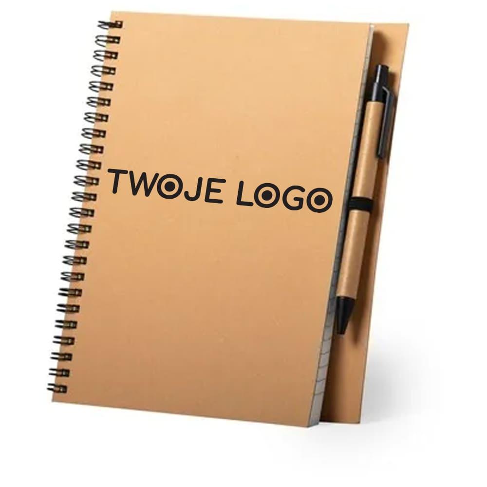 Notatnik (ok. A5, 80 kartek w linie), twarda okładka, długopis z papieru z recyklingu w komplecie, wkład długopisu w niebieskim kolorze, spiralne bindowanie