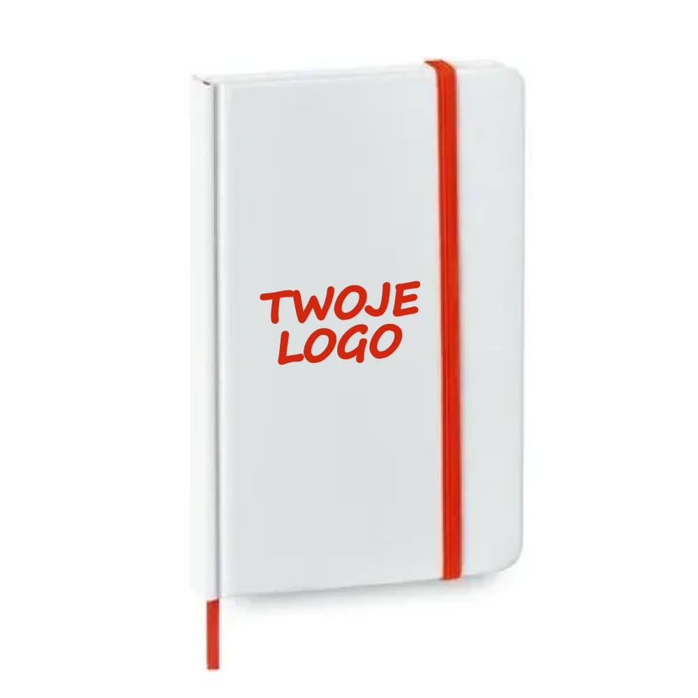 Notatnik (ok. A6, 80 pustych kartek), tasiemka zakładkowa, specjalna okładka pod znakowanie full colour, elastyczna opaska do zamykania