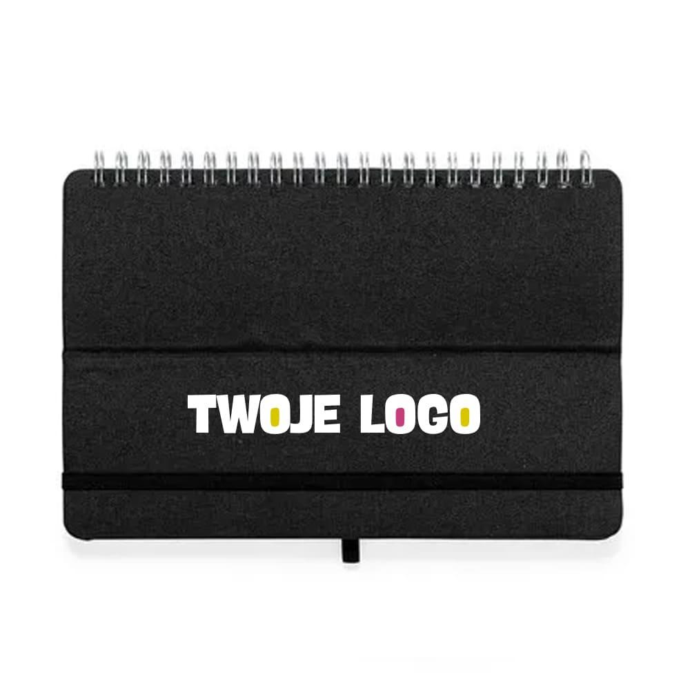 Notatnik RPET (ok. A5, 70 kartek w linie), stojak na telefon, stojak na tablet, twarda okładka, spiralne bindowanie, elastyczna opaska do zamykania, uchwyt na długopis