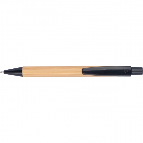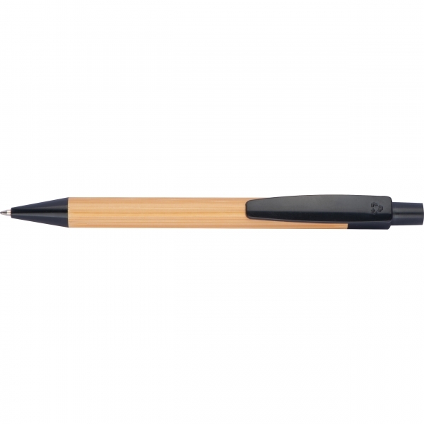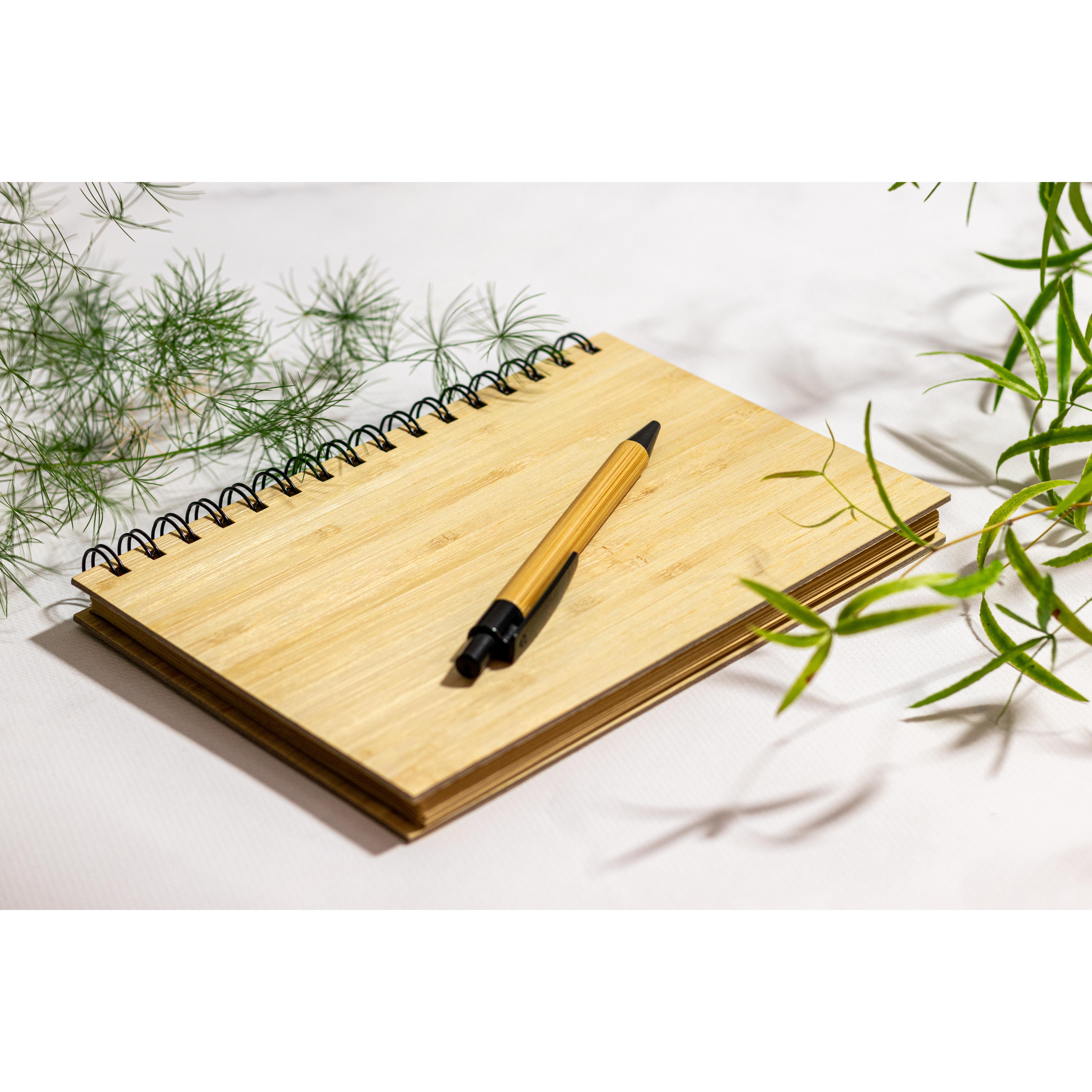 Notes o formacie A5, z bambusową okładką, 160 kartkami w linię wykonanymi z papieru pochodzącego z recyklingu. Całość zapakowana jest w kartonowe pudełko, w którym dodatkowo znajuje się bambusowy długopis, piszący na niebiesko.