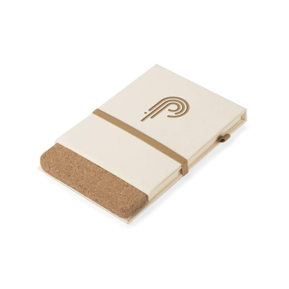 Okładka i kartki w notesie zostały wyprodukowane z kartonów po mleku. Okładka zamykana za pomocą elastycznej gumki. Korkowy element dopełnia ten produkt wizualnie, a także umożliwia stworzenie z notesu stojaka na telefon. Notes posiada 80 gładkich kartek.