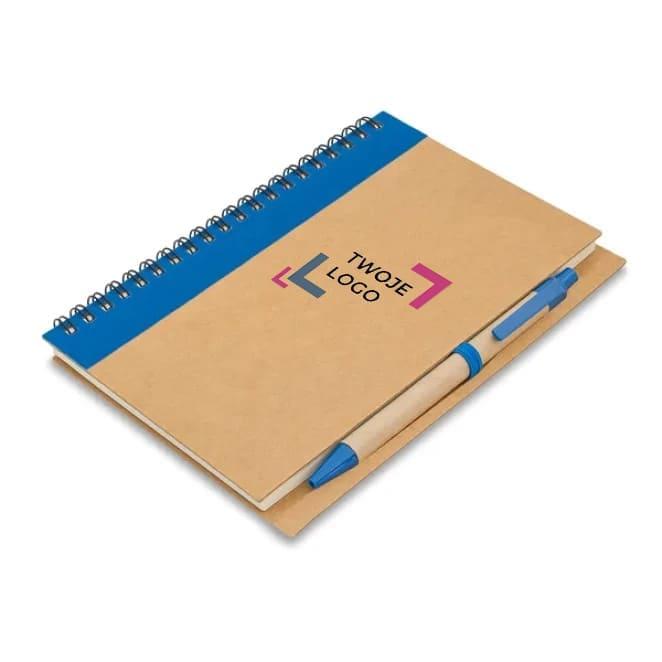Notes formatu B6 z 70 gładkimi kartkami (70 g/m2) i podwójną spiralą. Dopasowany długopis z kartonu z recyklingu. Wkład w kolorze niebieskim. Dopasowany elastyczny uchwyt na długopis.