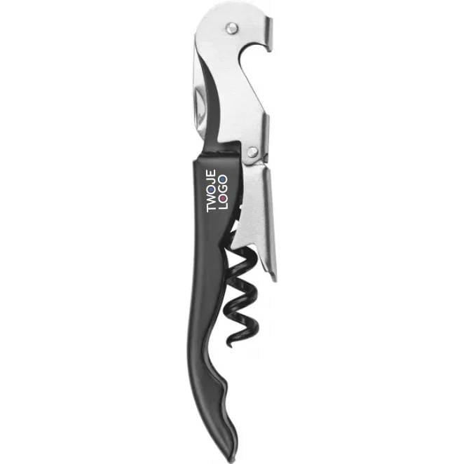 Metalowy nóż kelnerski z otwieraczem do butelek, obcinaczem do folii i korkociągiem z dwoma poziomami podnoszenia.