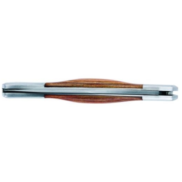 Składany nóż wykonany ze stali nierdzewnej, z drewnianą rękojeścią i blokadą bezpieczeństwa.