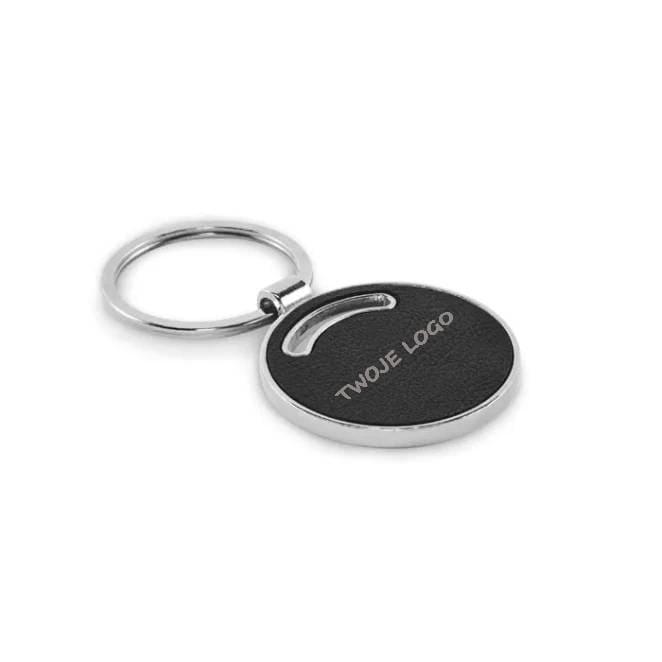 Okrągły metalowy brelok z wkładką ze skóry PU pochodzącej z recyklingu.