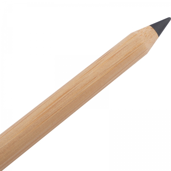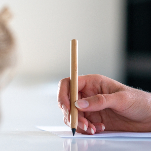 Ołówek wieczny wykonany z lekkiego bambusa. Jego fenomen polega na tym, że zamiast standardowego wkładu z grafitu zastosowany został specjalny stop metali, który znaczy papier na kolor grafitowy.