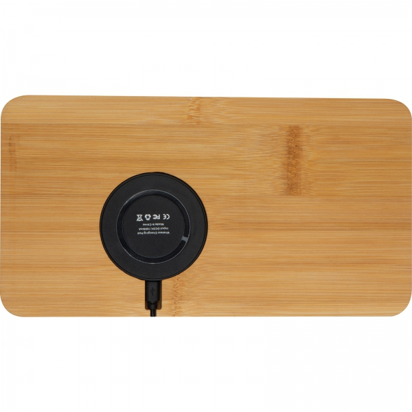 Bambusowy organizer na biurko z uchwytem na smartfona, bezprzewodową ładowarką i miejscem na przybory biurowe. W zestawie kabel ładujący USB.