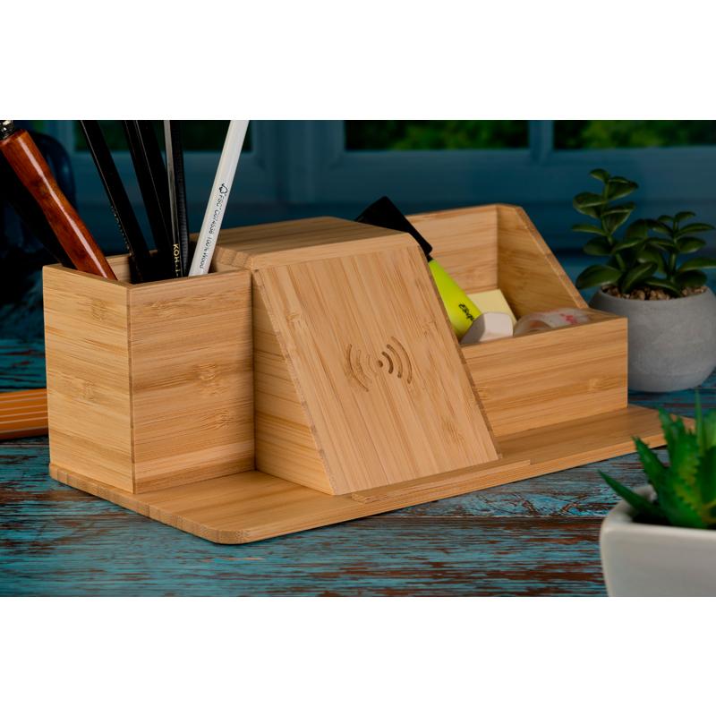 Organizer na biurko wykonany z bambusa, z wbudowaną ładowarką indukcyjną o mocy 10 wat i dwoma przegródkami na przybory biurowe.