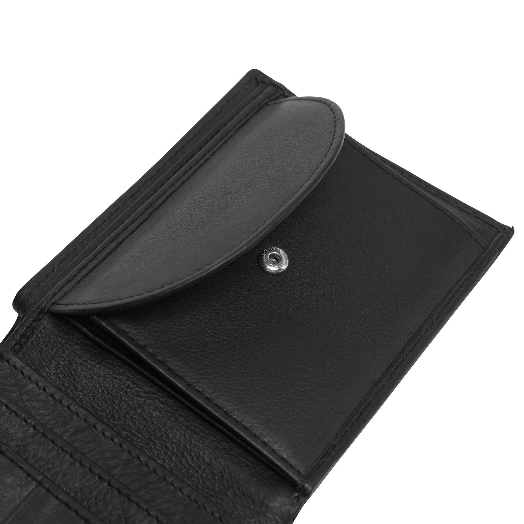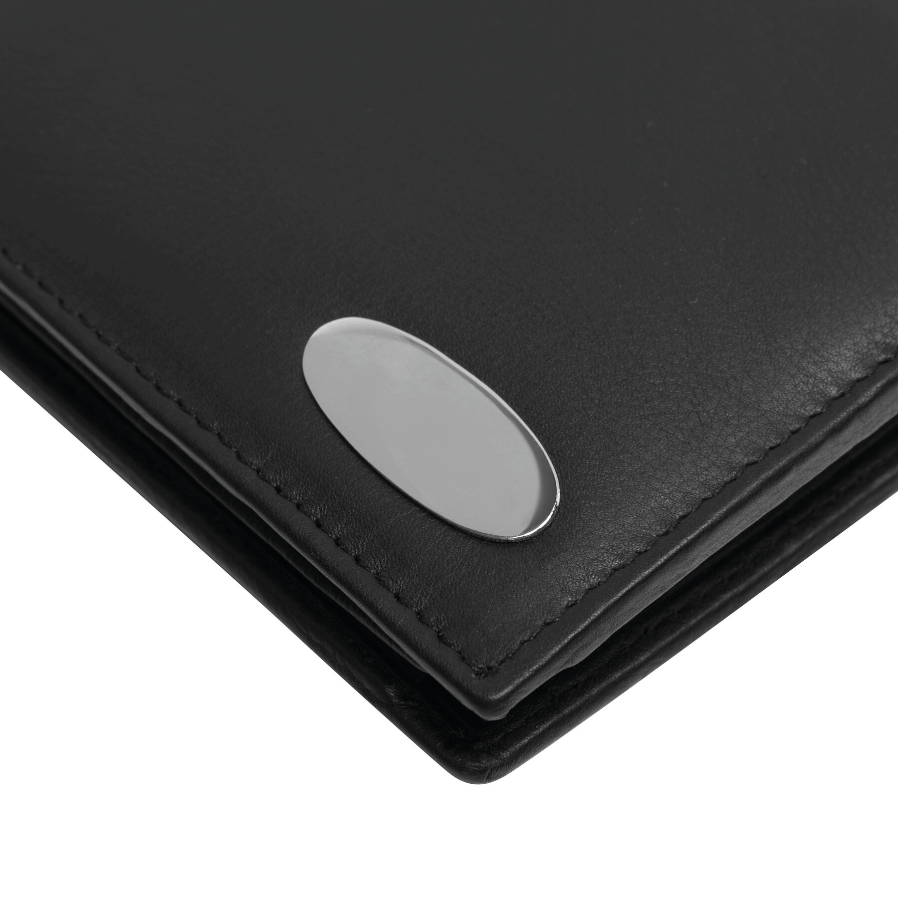 Oryginalny skórzany portfel DAX z wsuwanymi kieszeniami na karty, jedną siatkowaną kieszenią na dowód osobisty, dwiema dużymi kieszeniami na banknoty, kieszenią z zatrzaskiem na monety i z owalną metalową płytką na logo.