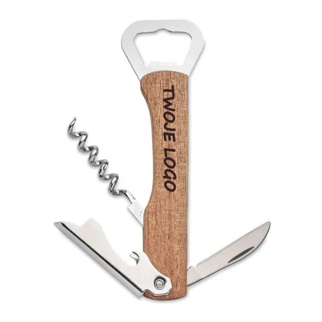 Otwieracz do butelek 3 w 1 w obudowie z drewna akacjowego. Zawiera korkociąg, 2 otwieracze do butelek i nóż.