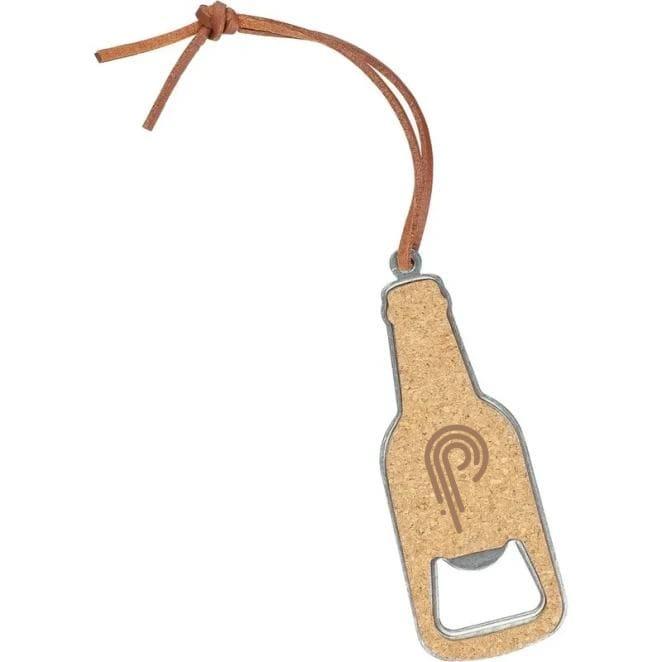 Otwieracz do butelek, pakowany pojedynczo w brązową papierową kopertę, produkt wykonany z korka i stali nierdzewnej, sznurek wykonany z PU