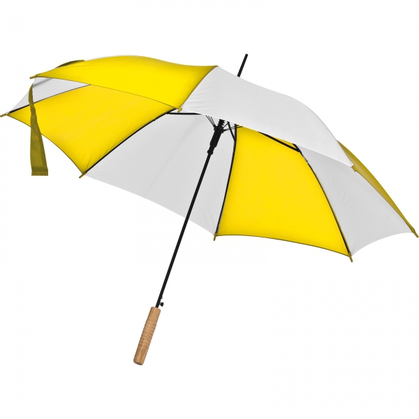 Dwukolorowy parasol automatyczny z prostą, drewnianą rączką. Wykonany z poliestru 170T.