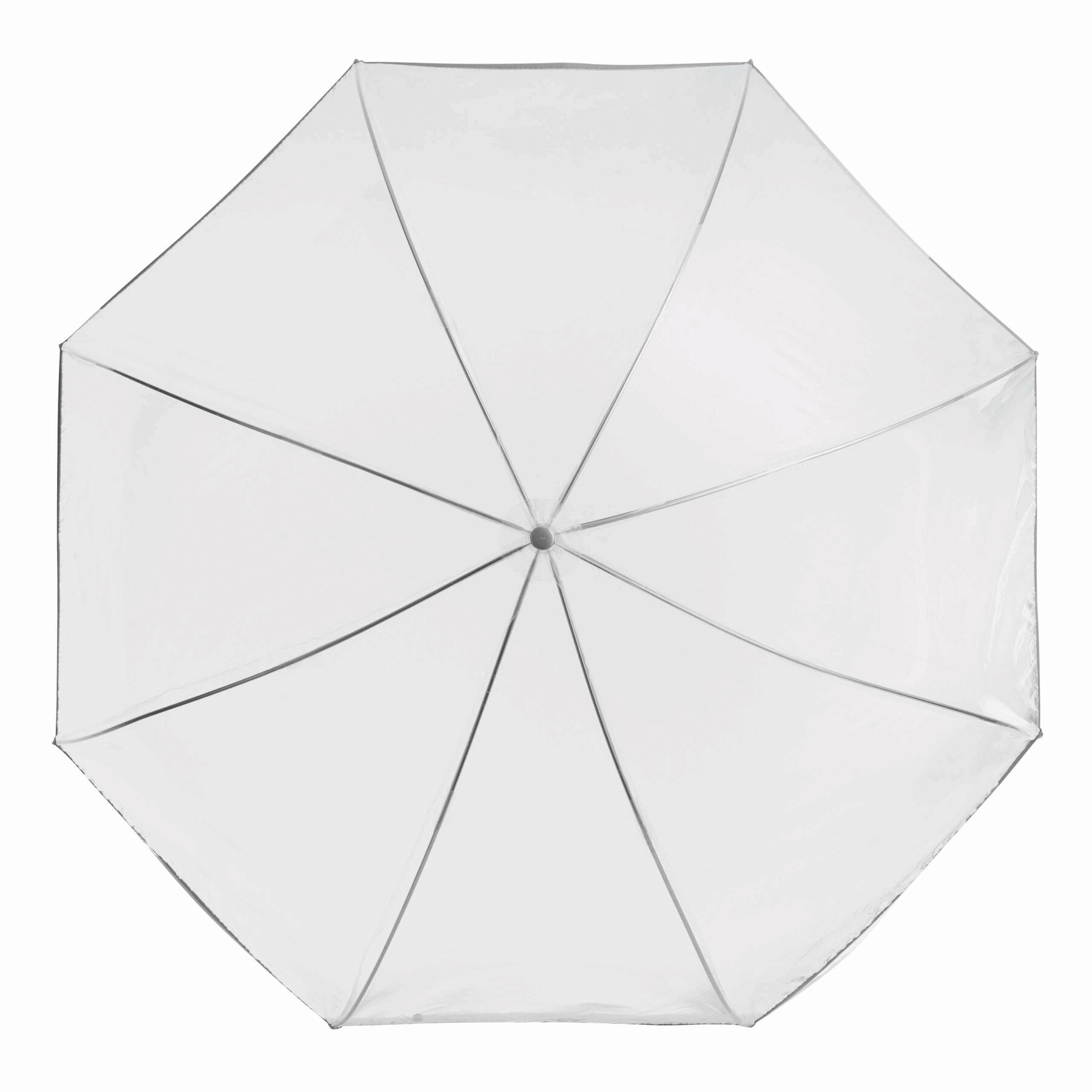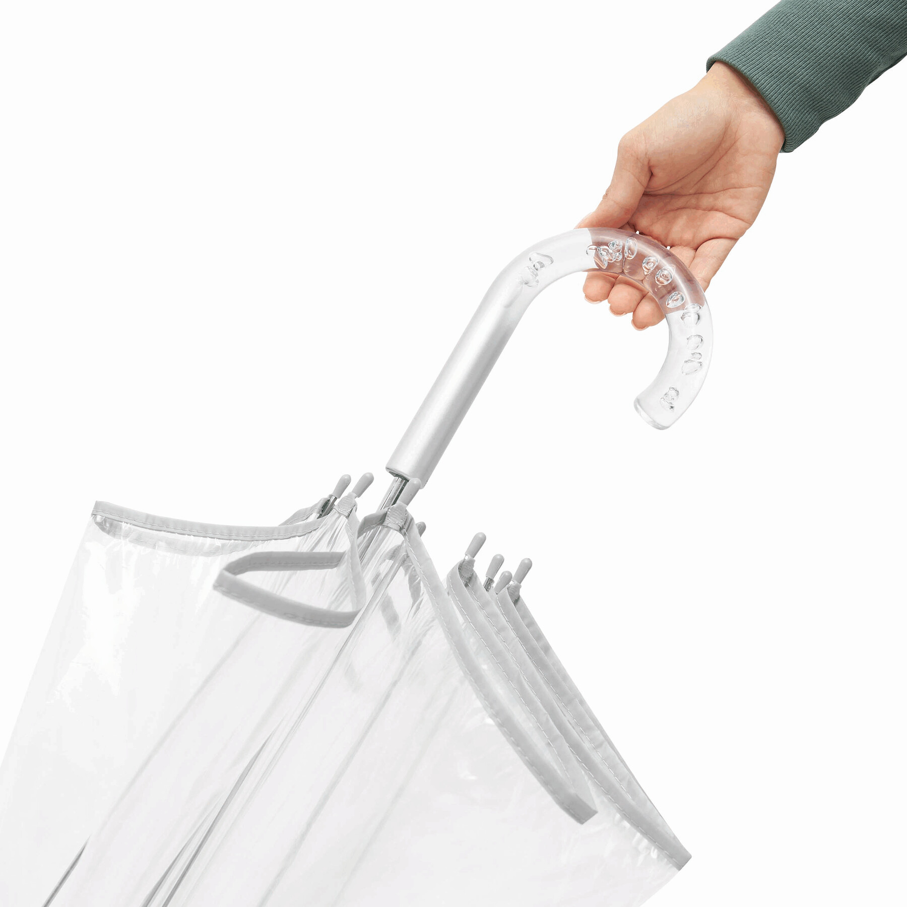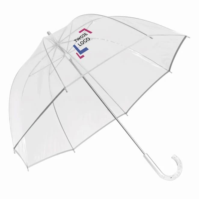 Parasol BELLEVUE z czaszą w kształcie dzwonu, z transparentnym uchwytem z tworzywa z zatopionymi pęcherzykami powietrza. Poszycie z transparentnej folii POE, laska i szyny metalowe, srebrna lamówka i zatrzask w pasku spinającym.