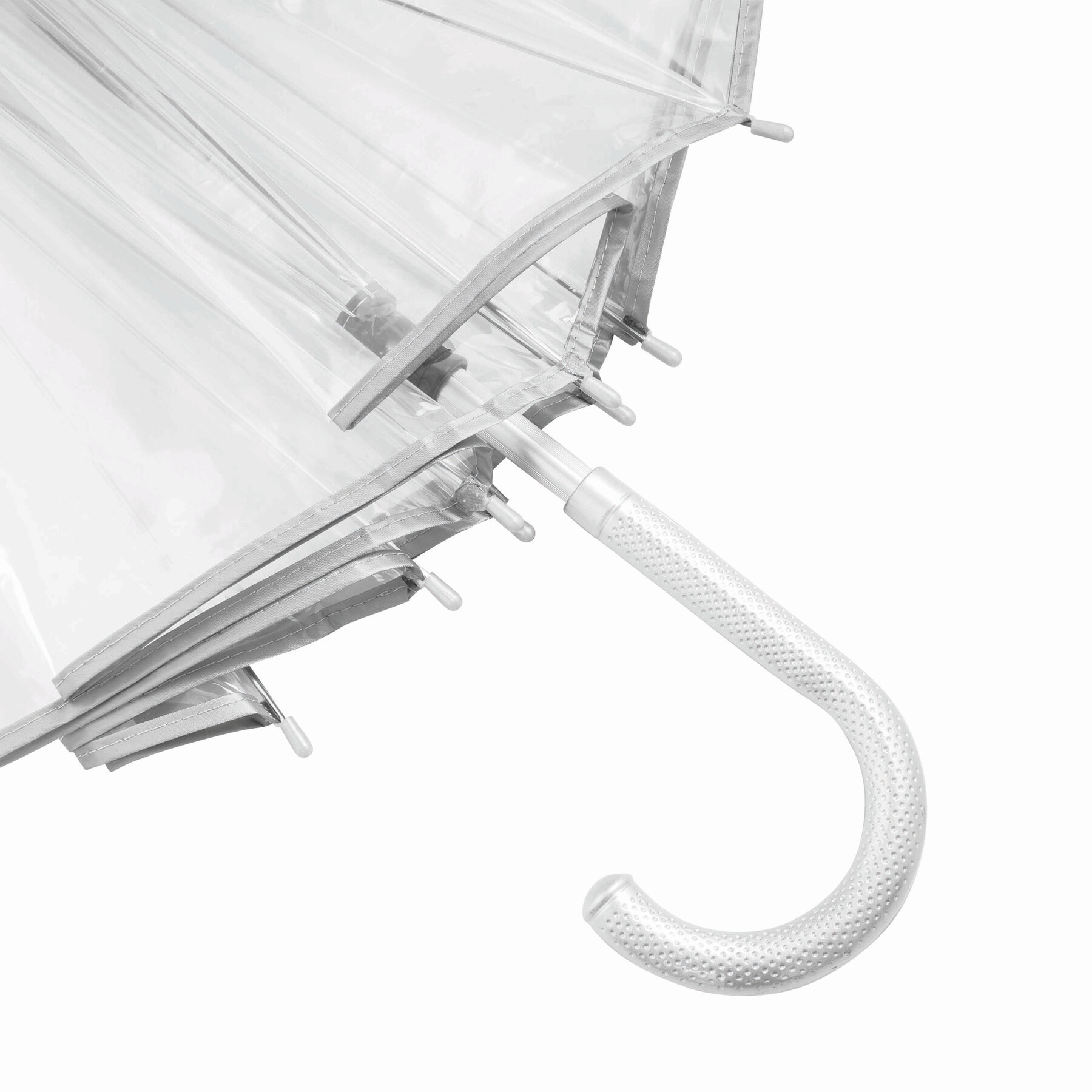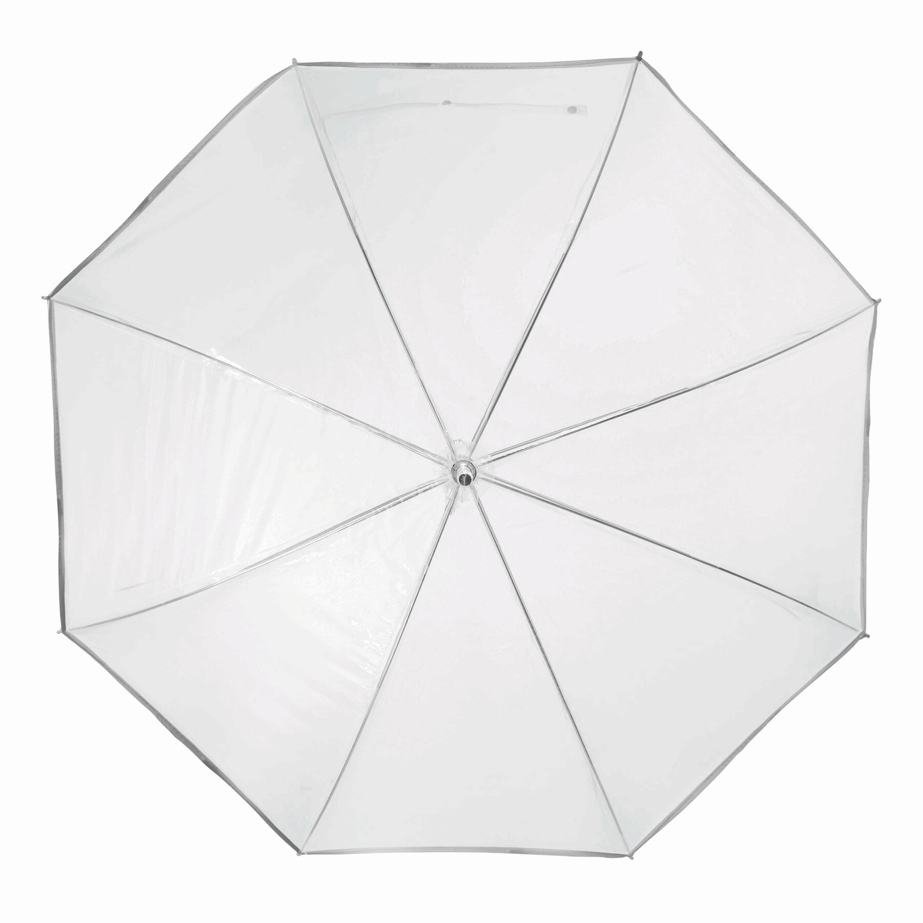 Transparentny parasol PANORAMIX z zaokrąglonym uchwytem. Poszycie z folii POE, srebrna lamówka, metalowe szyny, kolce z tworzywa sztucznego.