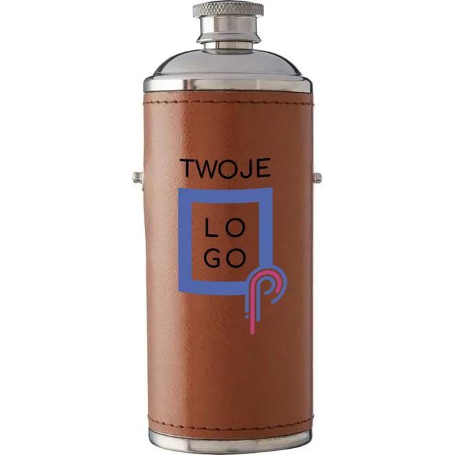 Piersiówka 230 ml z dwoma kieliszkami 40 ml, mocowanie u góry za pomocą pasków z przyciskami, zapakowana w brązowy kartonik, produkt wykonany ze stali nierdzewnej i PU