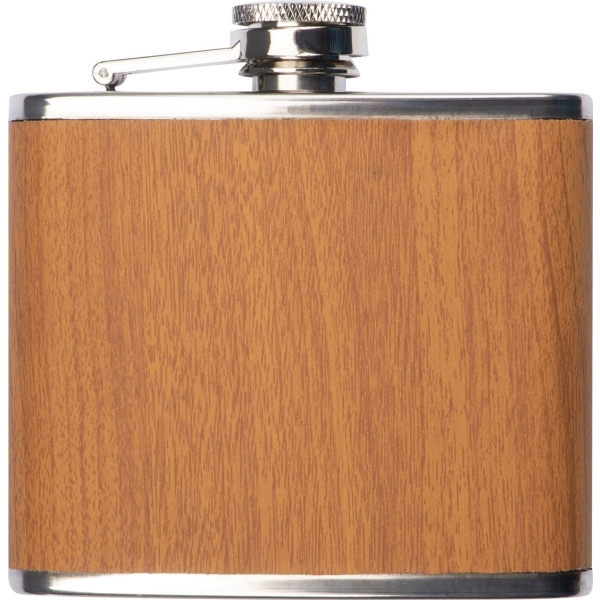 Piersiówka o pojemności 170 ml. Wykonana ze stali nierdzewnej z drewnianą powłoką i zabezpieczającym mechanizmem śrubowym.