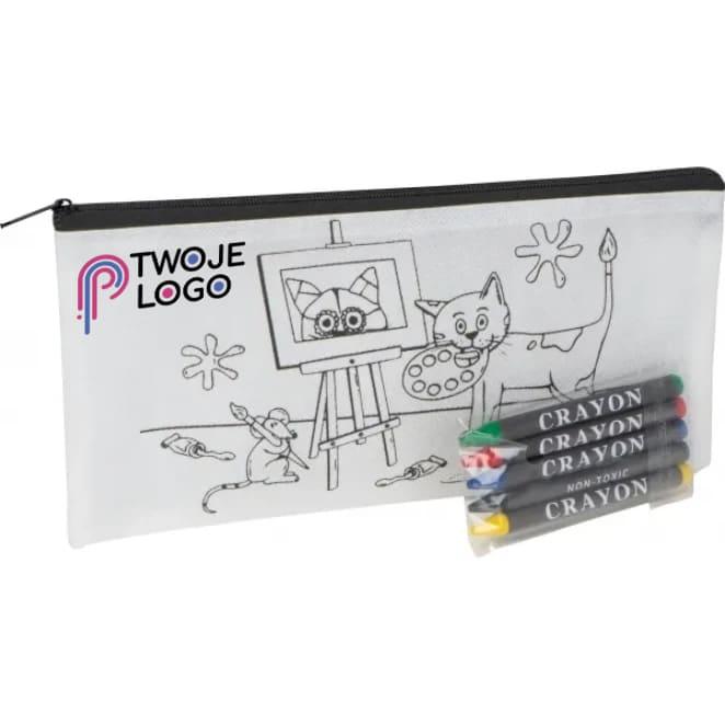 Piórnik wykonany z non-woven z kolorowanką i 5 kredkami świecowymi do kolorowania.