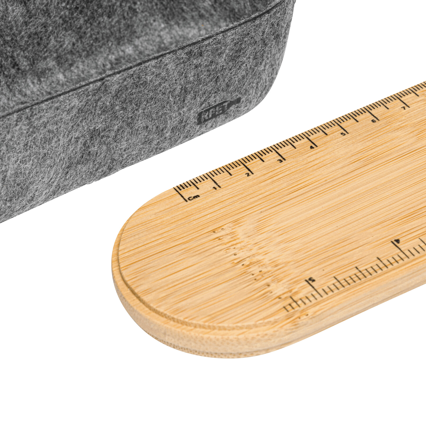Piórnik PEN STORE wykonany z filcu RPET z bambusową pokrywą i elastyczną opaską, pokrywka z linijką (cm i cale) po jednej stronie i stojakiem na telefon komórkowy po drugiej.