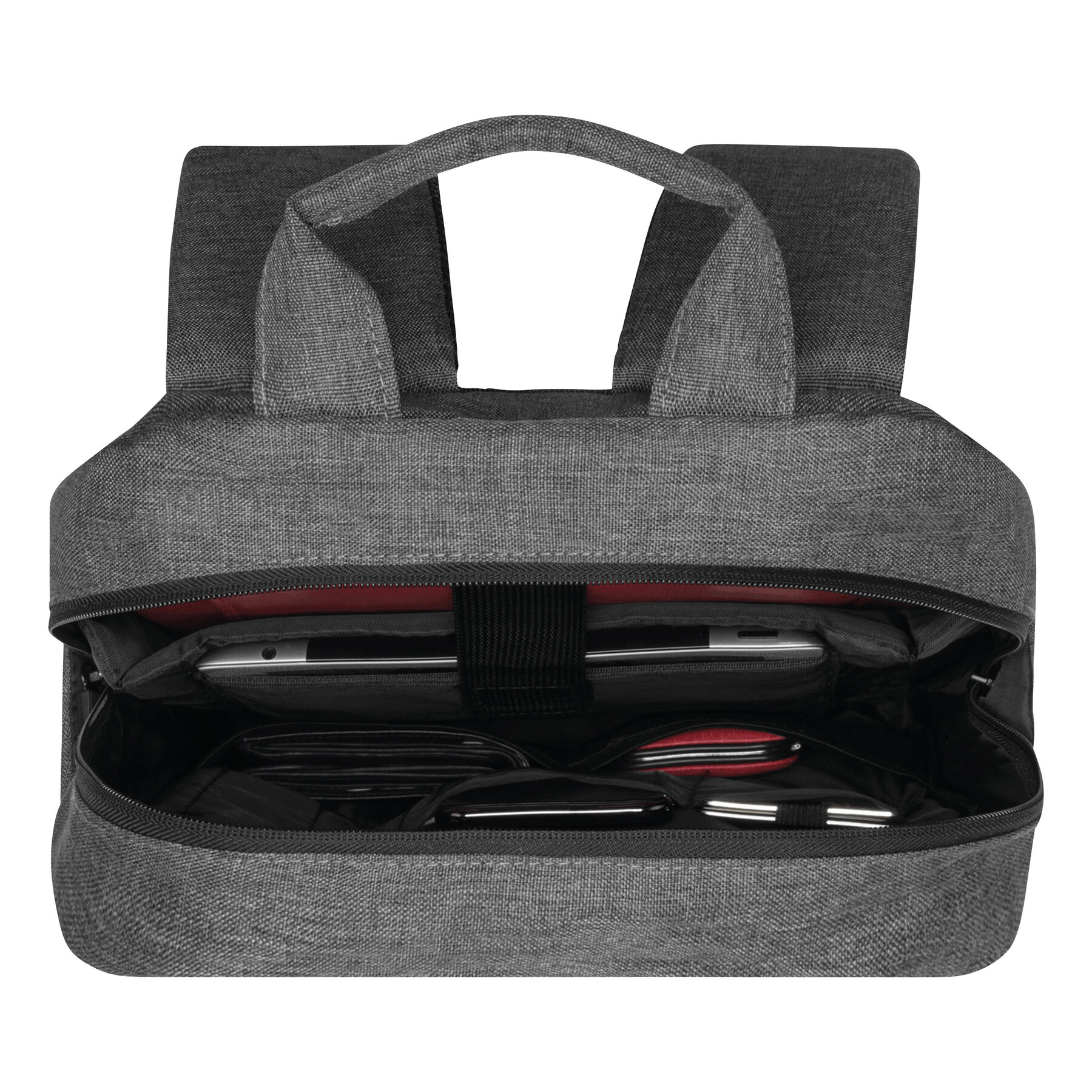 Plecak CAMBRIDGE z poziomą przednią kieszenią z zamkiem błyskawicznym, 1 kieszenią do wsuwania dokumentów, 1 główną przegrodą z zamkiem błyskawicznym i 1 wyściełaną przegrodą wewnętrzną na laptopa lub tablet, z organizerem z 6 wsuwanymi kieszeniami. Posiada wyściełane i ergonomicznie ukształtowane szelki oraz wyściełane oparcie pleców.