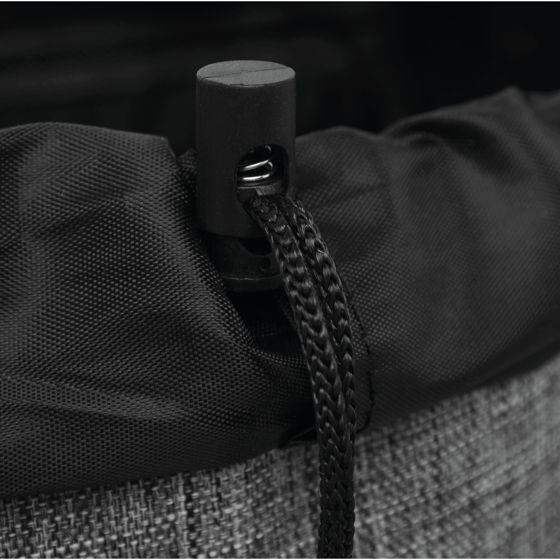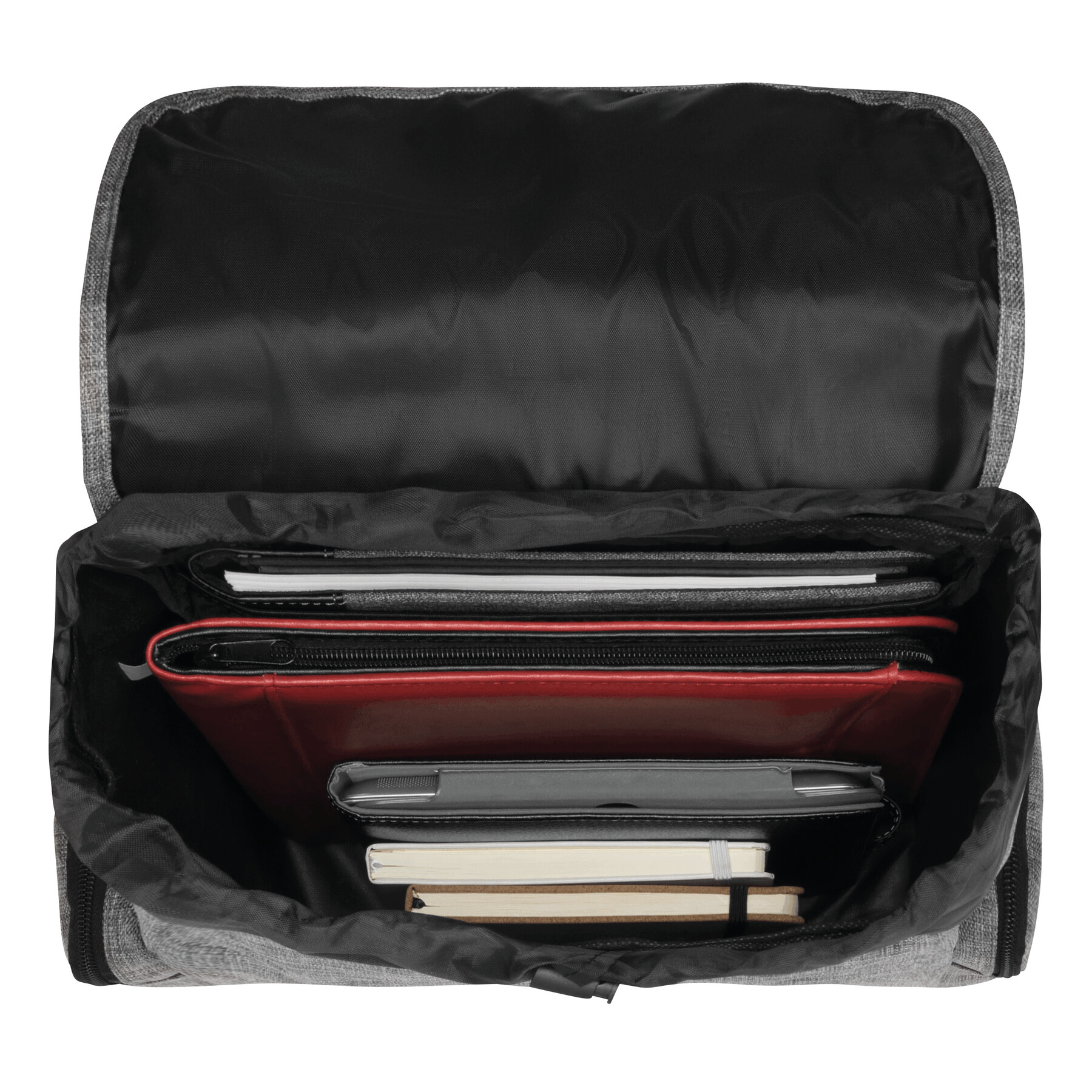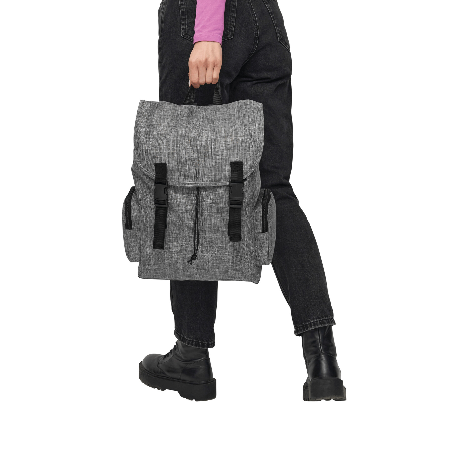 Plecak DONEGAL S z główną komorą ze sznurkami do zaciągania, dwoma zatrzaskami i wyściełaną przegrodą na laptopa w środku, dwie boczne kieszenie na zamek, uchwyt do przenoszenia, wyściełane szelki i tylna ścianka.