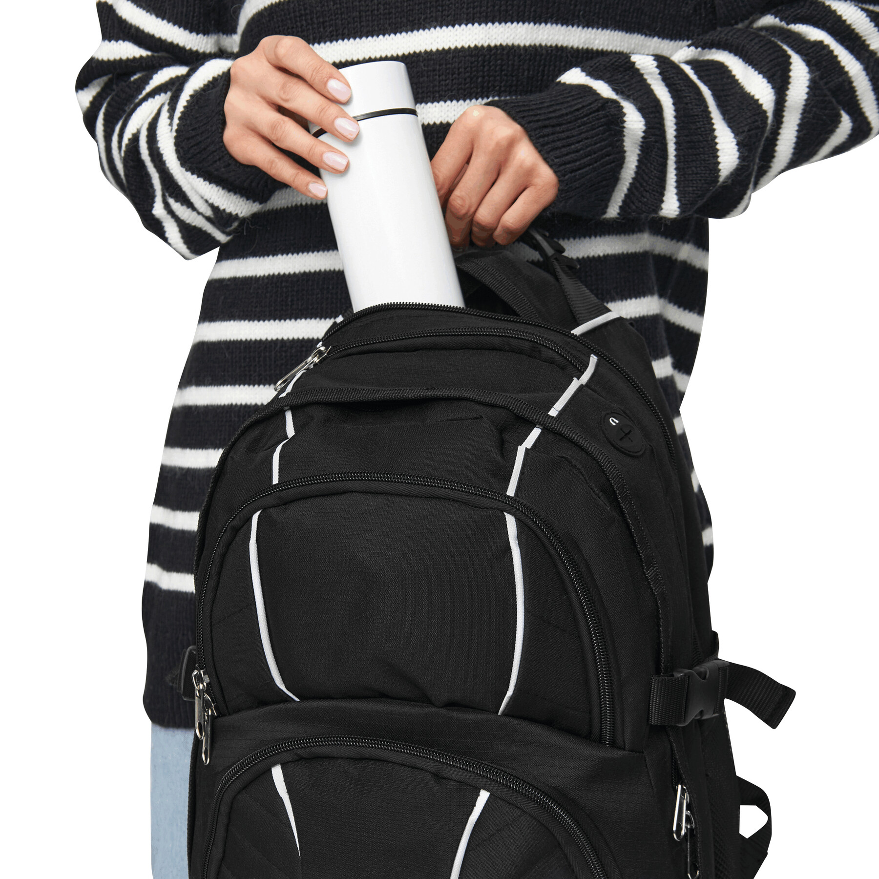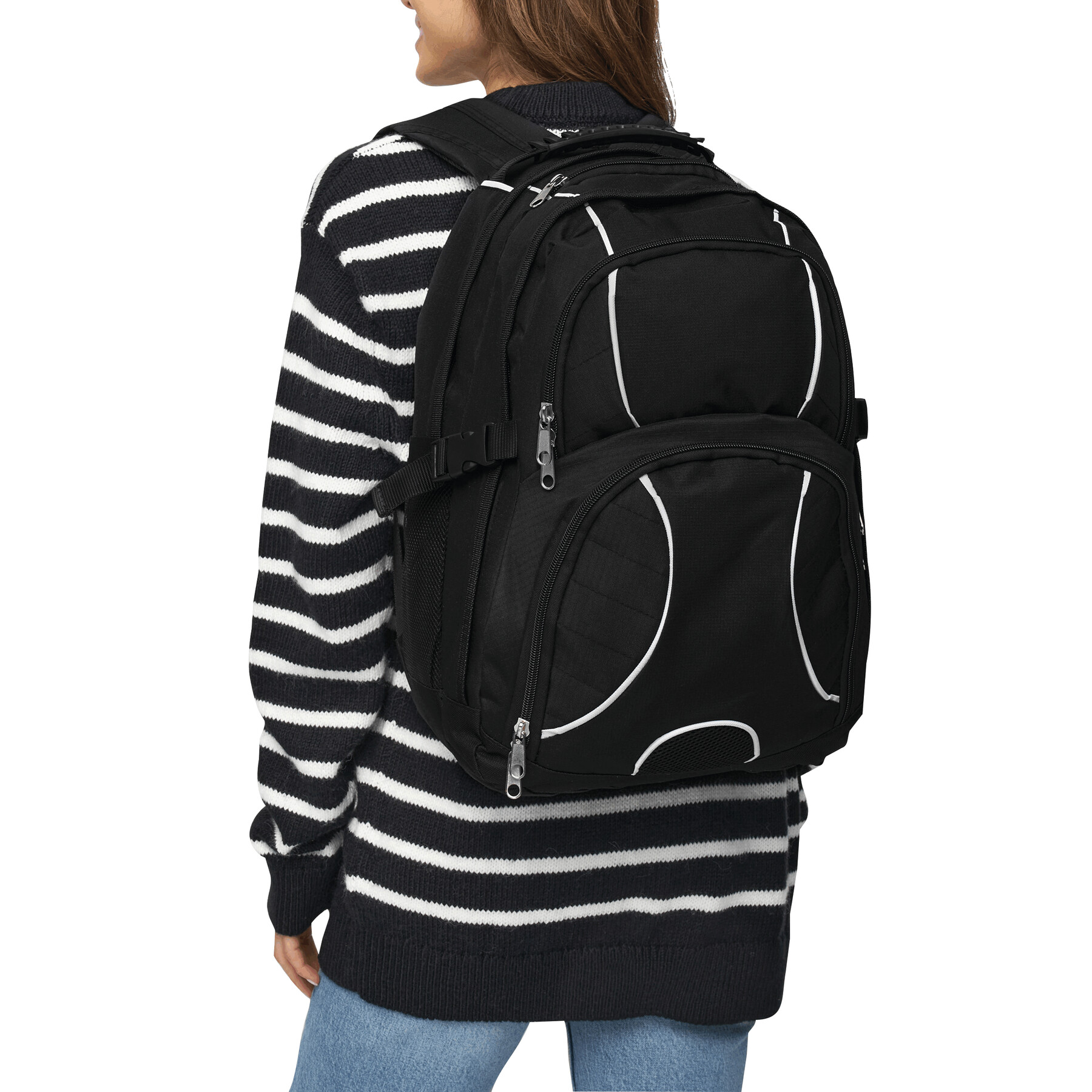 Plecak HYPE z dwiema przednimi kieszeniami zapinanymi na suwak, w tym jedna z mniejszymi kieszonkami w środku, dwie główne komory na suwak. Jedna usztywniana na laptopa, a druga na odtwarzacz CD lub inny sprzęt, z otworem na kabel słuchawek, jedna kieszeń na klucze, dwie kieszenie z siatki po bokach, z mocną rączką, wyściełanymi ramiączkami i wzmocnionym tyłem.