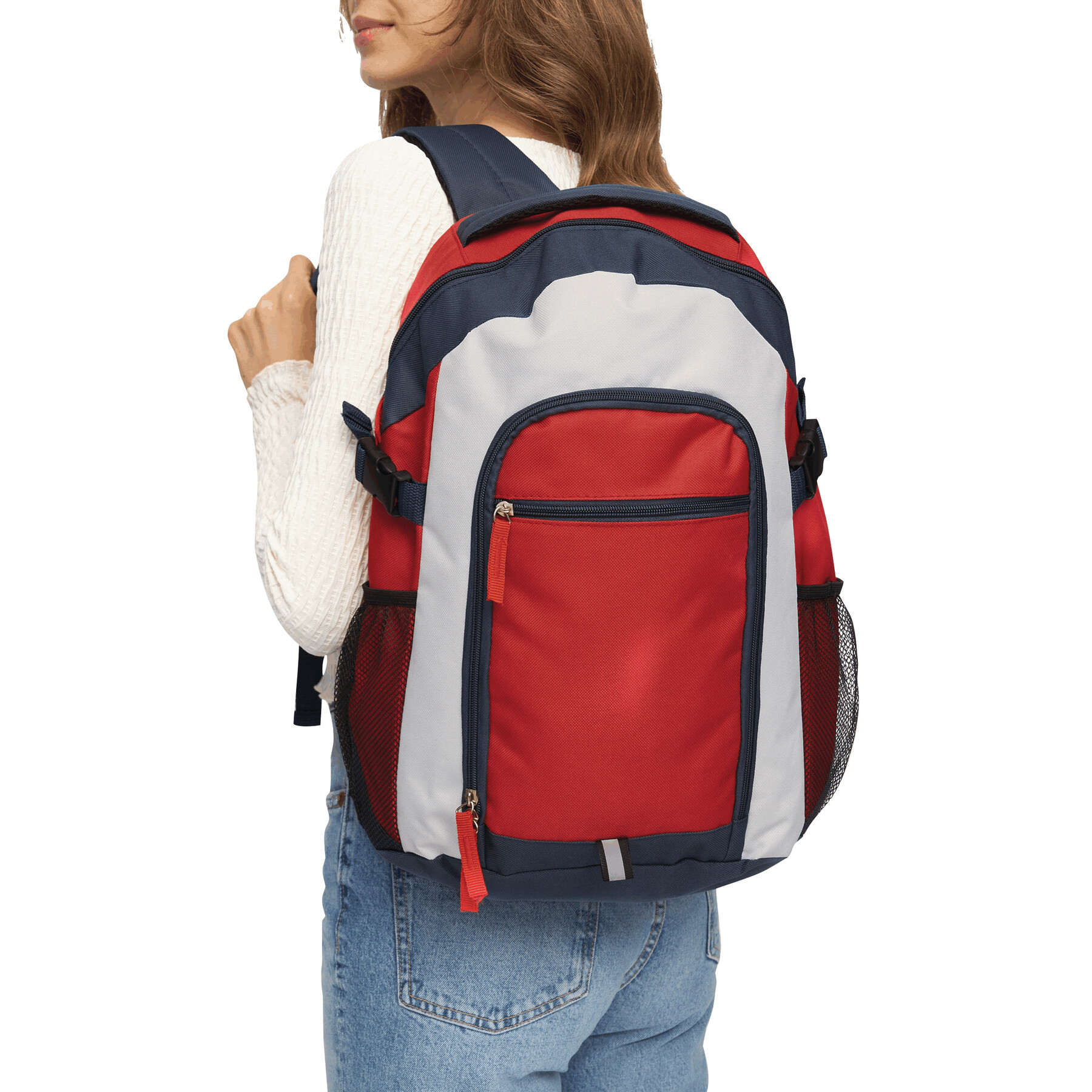 Plecak MARINA, z komorą główną, kieszenią przednią oraz kieszonkami dodatkowymi zapinanymi na zamek, dwiema bocznymi kieszeniami z siatki, bocznymi paskami zaciskowymi, wzmocnionym uchwytem, wyściełane szelki oraz tył plecaka.