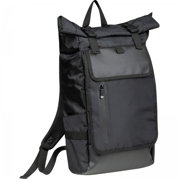Plecak na laptopa wykonany z poliestru, z wyściełaną przegródką na laptopa o wymiarach 15,6` i wieloma dodatkowymi przegródkami. Plecak ma praktyczne rolowane zamknięcie, dzięki któremu można manipulować jego pojemnością.