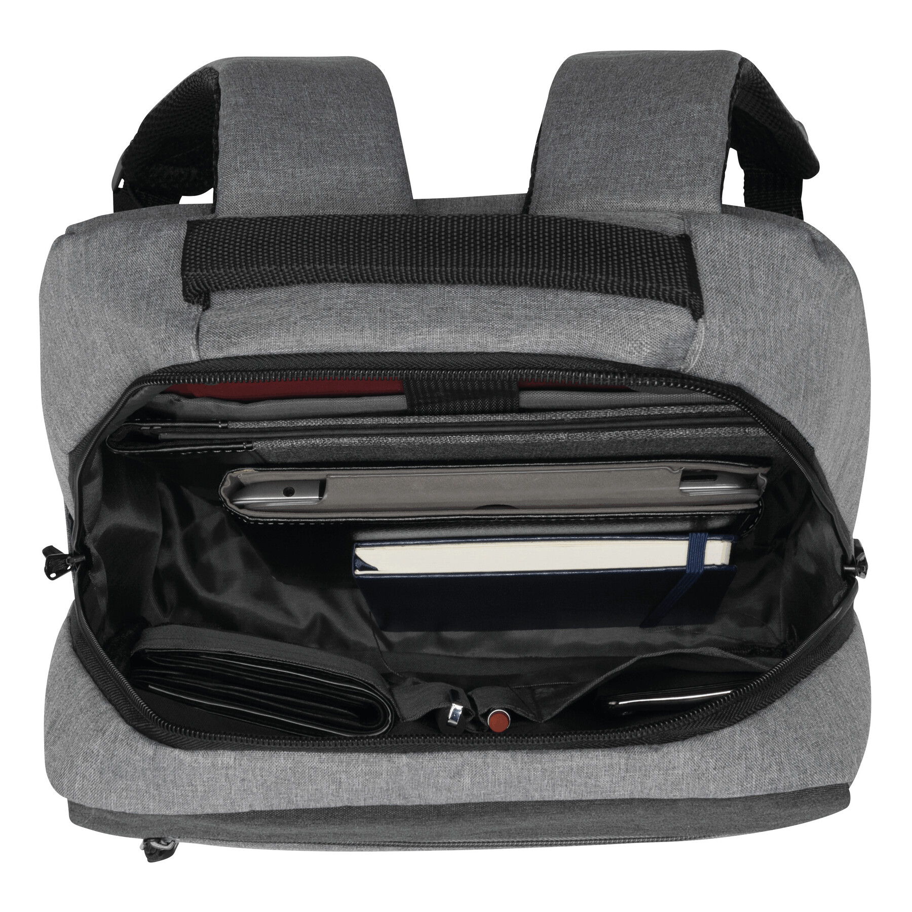 Plecak NORDIC LINE. 2 przednie kieszenie zamykane na zamek błyskawiczny, komora główna z zamkiem i watowaną wewnętrzną kieszenią na laptop lub tablet, organizer z 4 kieszonkami, 1 boczna kieszonka, watowana rączka, ergonomiczne paski na ramię wspierające plecy