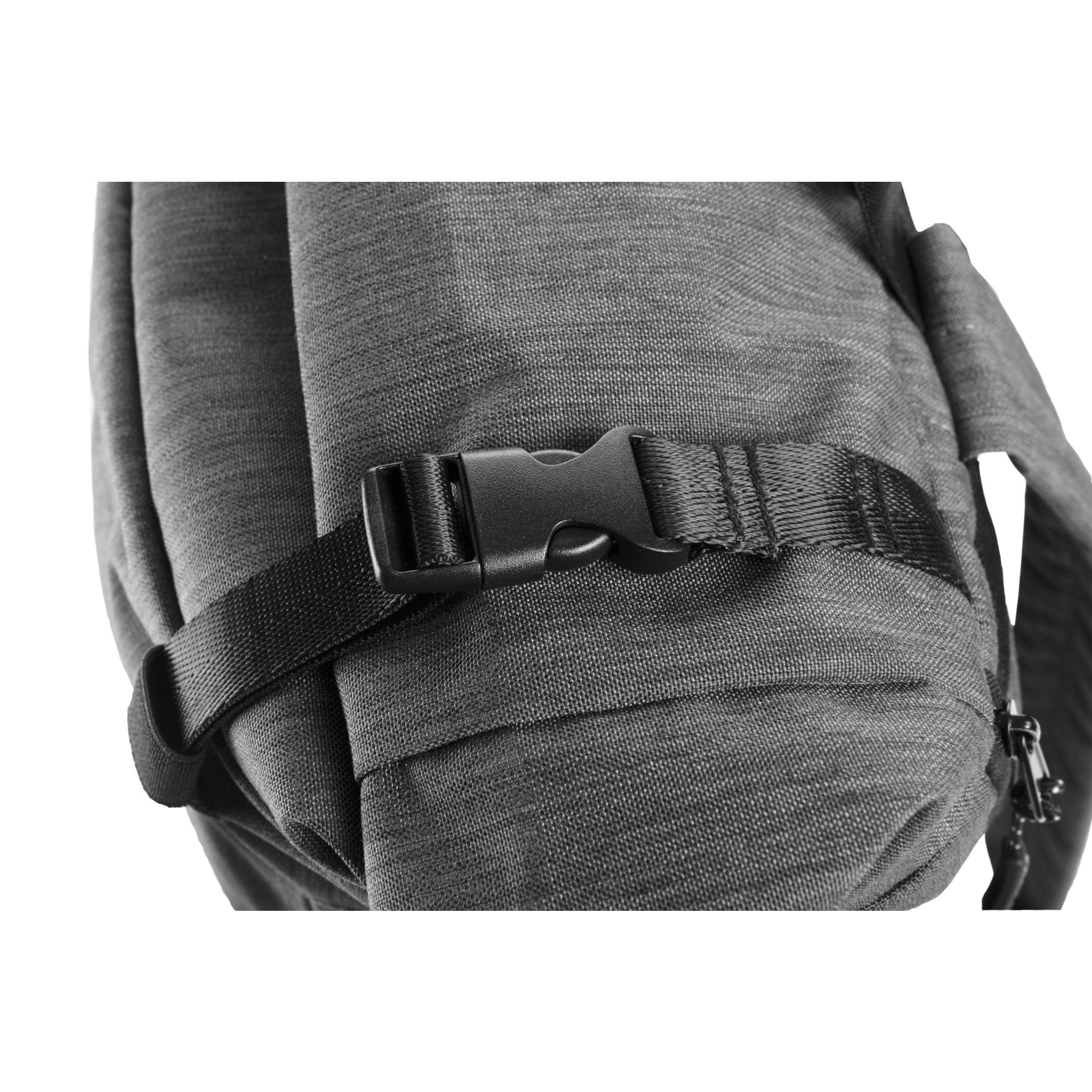 Plecak ze zwijanym zamknięciem, wyposażony w dwie frontowe kieszenie zapinane na zamek, dwie boczne kieszonki, zamek z tyłu zapewniający dostęp do dużej komory głównej, która została wydzielona na jedną dużą kieszeń oraz jedną małą - na akcesoria. Po zrolowaniu górnej części plecaka całość zamykamy dwoma paskami z plastikowymi klamerkami. Plecak posiada watowane szelki i plecy.