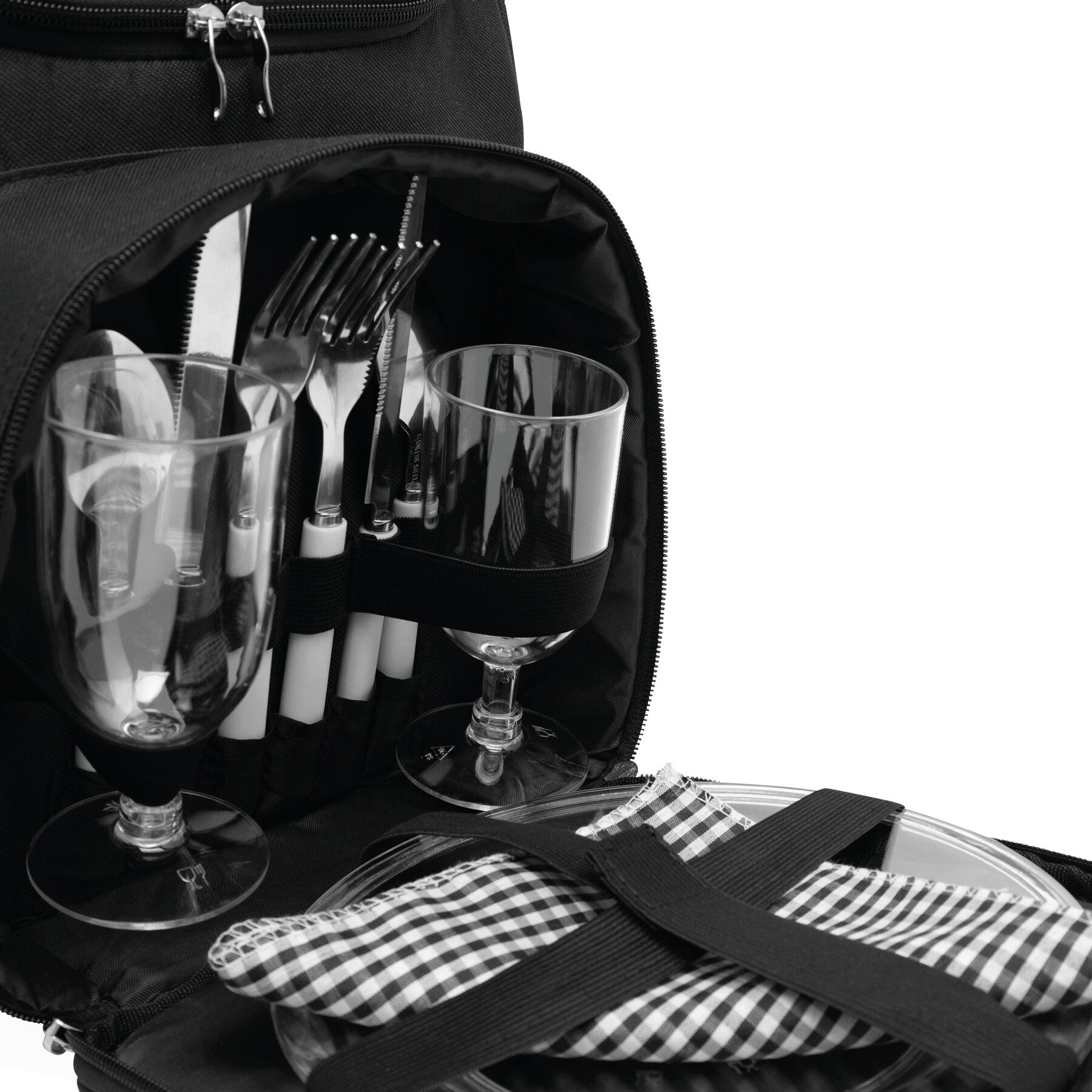 Plecak piknikowy OUTSIDE dla 2 osób z izolowaną kieszenią główną. Kieszeń przednia z plastikowymi sztućcami, 2 plastikowe talerze i kieliszki, 2 materiałowe serwetki, 2 siatkowane kieszonki po bokach, rączka do przenoszenia i ergonomicznie wykładane paski na ramiona.