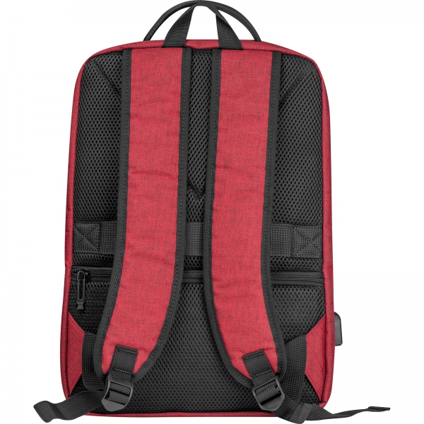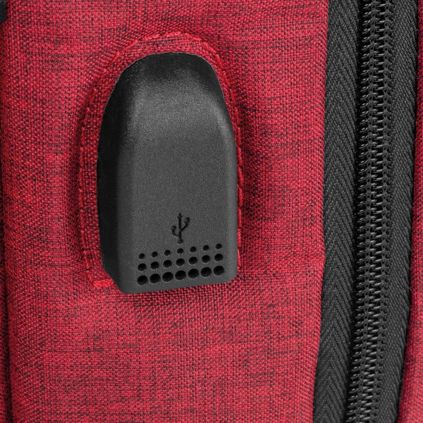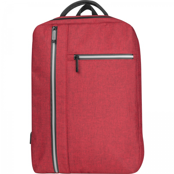 Wodoodporny plecak wykonany z nylonu, z watowanymi szelkami, przegrodą na laptopa 15,6`, wyjściem na kabel USB i dwiema przednimi kieszeniami.