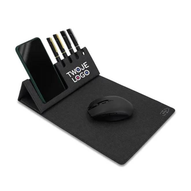 Składana podkładka pod myszkę wykonana z RPET. Posiada stojak na telefon komórkowy oraz uchwyty na cztery długopisy.