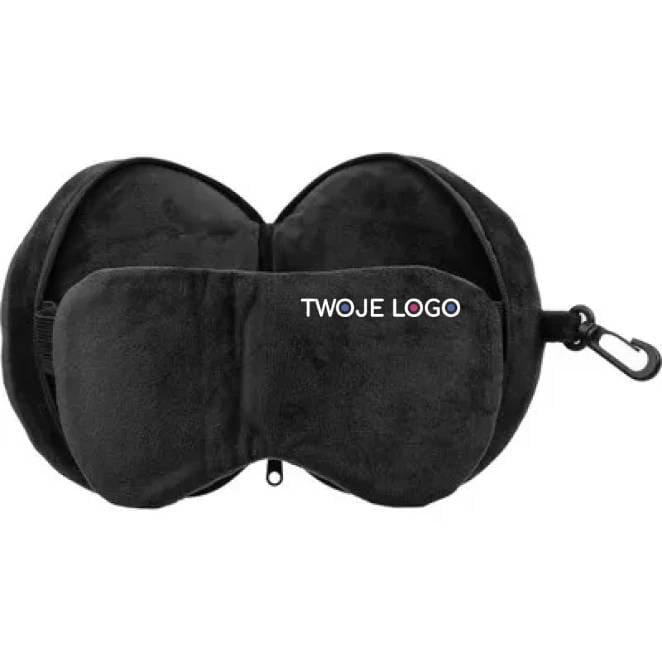 Poduszka podróżna, zawiera opaskę na oczy, po rozpięciu zamienia się w poduszkę, wyposażona w karabińczyk, umożliwiający łatwe przymocowanie podczas podróży, wykonana z miękkiego poliestru i wypełniona bawełną PP
