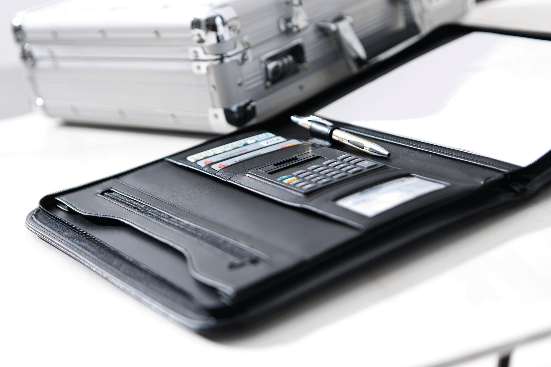 Portfolio GENTLE, format A4, zamykane na zamek błyskawiczny, wewnętrzne przegródki w tym jedna przezroczysta, wewnętrzna kieszonka zapinana na zamek, kalkulator, notes, pętelka na długopis oraz jedna kieszonka zewnętrzna.