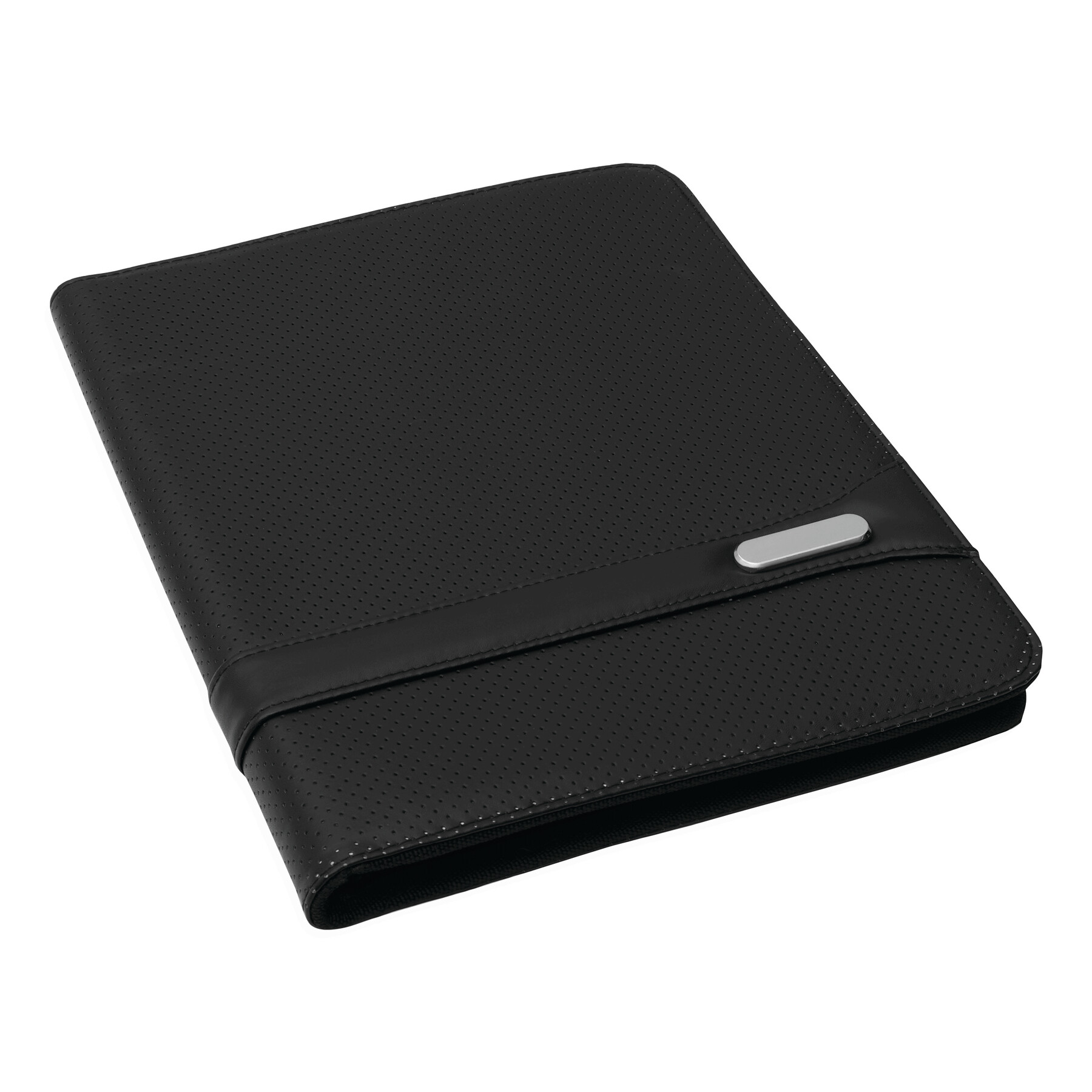 Portfolio MANHATTAN w formacie A4, zapięcie na suwak, wewnątrz wsuwane kieszonki, 1 przezroczysta kieszeń, kieszeń na suwak, z notesem, oczkiem na długopis, metalowa płytka na reklamę.