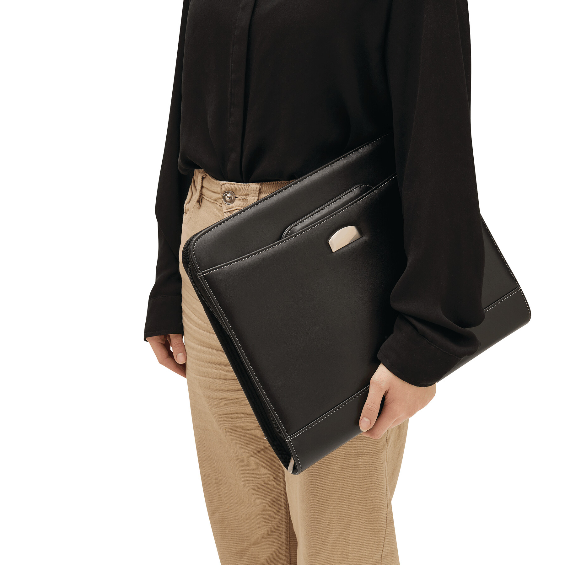 Portfolio NOBLESSE RING, portfolio ze skóry ekologicznej, w formacie A4, z zamkiem błyskawicznym, zatrzaskiem segregatorowym, kalkulatorem, notesem, miejscem na długopis, wieloma kieszonkami, uchwytem, dekoracyjnymi przeszyciami i metalową płytką do grawerowania.