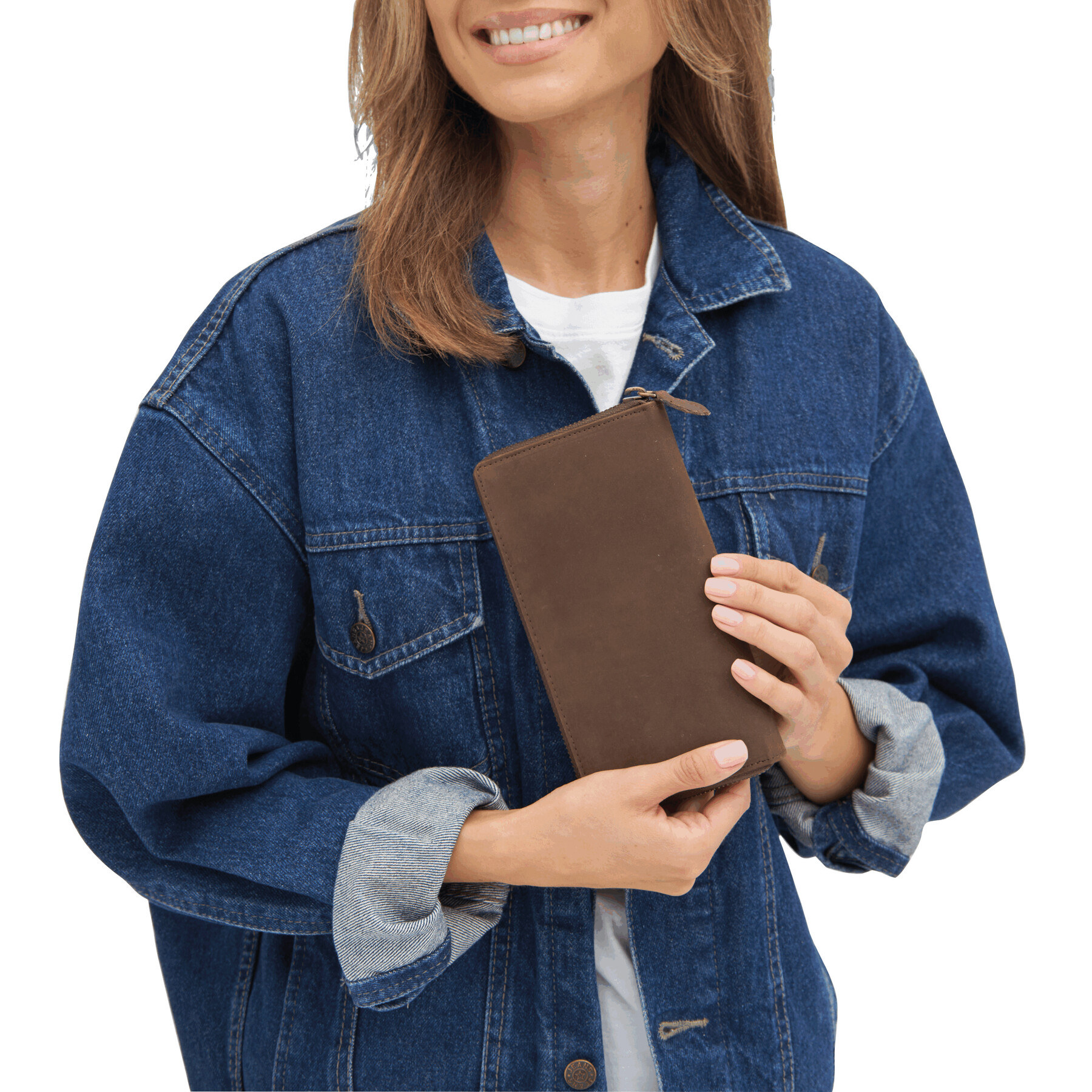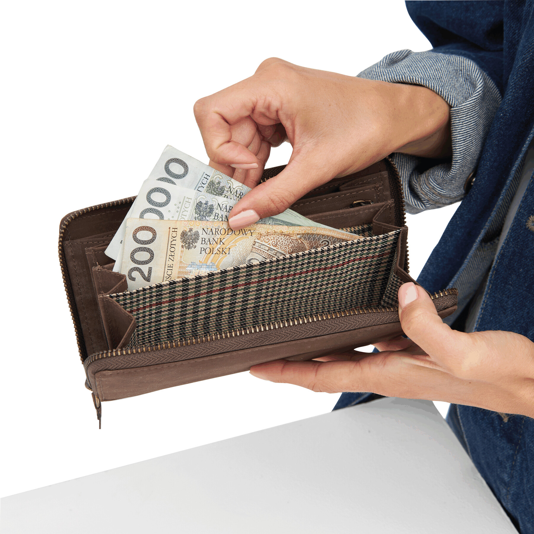 Portmonetka ze skóry naturalnej LADY z zamkiem błyskawicznym. 12 kieszonek na karty z osłoną RFID w celu ochrony przed niepożądanym skanowaniem, 3 kieszonki na banknoty, 1 kieszeń na monety z zamkiem błyskawicznym.